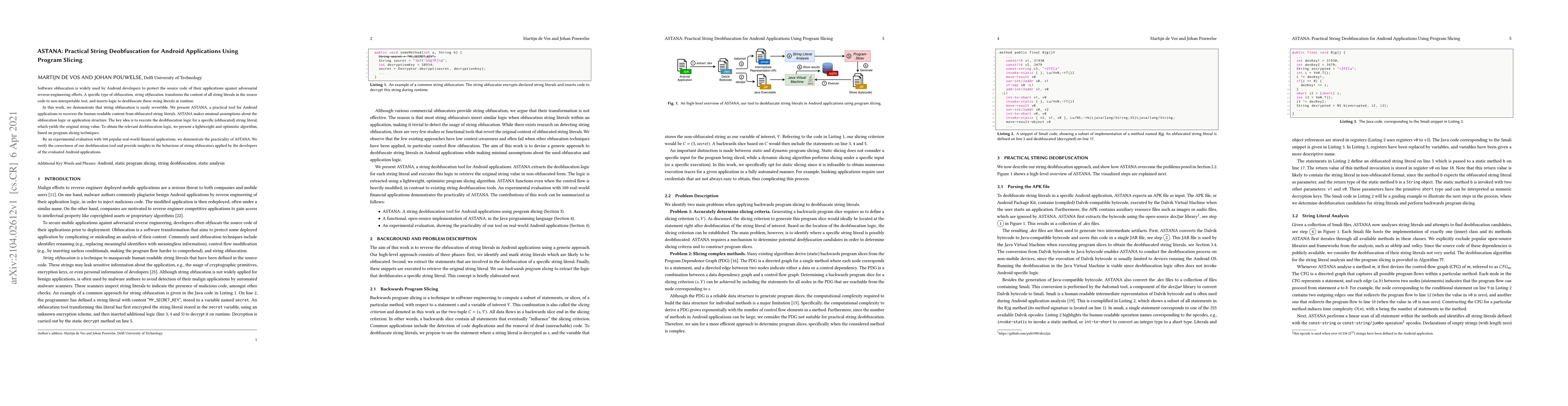 ASTANA is a tool for reversing string obfuscation in Android apps by executing deobfuscation logic and using program slicing. Experimental results on 100 popular financial apps show its effectiveness and provide insights into developers' obfuscation practices.