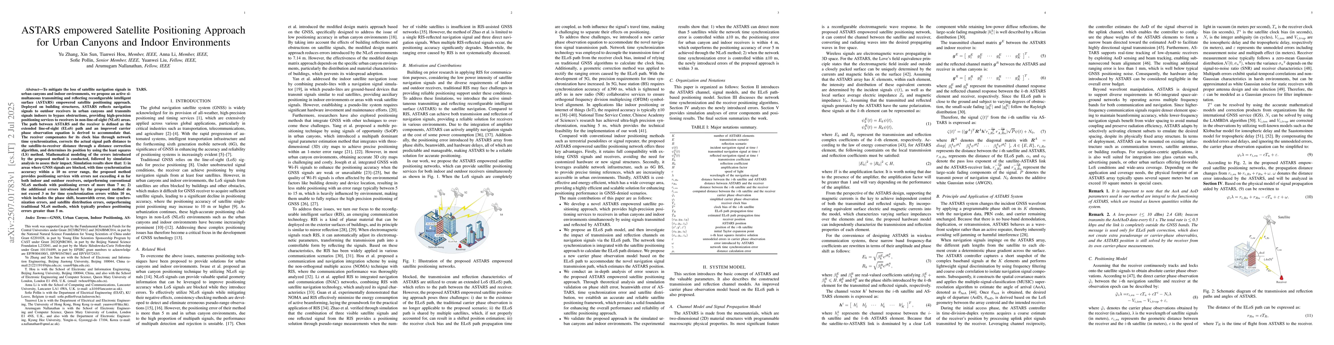 To mitigate the loss of satellite navigation signals in urban canyons and indoor environments, we propose an active simultaneous transmitting and reflecting reconfigurable intelligent surface (ASTARS) empowered satellite positioning approach. Deployed on building structures, ASTARS reflects navigation signals to outdoor receivers in urban canyons and transmits signals indoors to bypass obstructions, providing high-precision positioning services to receivers in non-line-of-sight (NLoS) areas. The path between ASTARS and the receiver is defined as the extended line-of-sight (ELoS) path and an improved carrier phase observation equation is derived to accommodate that. The receiver compensates for its clock bias through network time synchronization, corrects the actual signal path distance to the satellite-to-receiver distance through a distance correction algorithm, and determines its position by using the least squares (LS) method. Mathematical modeling of the errors introduced by the proposed method is conducted, followed by simulation analysis to assess their impact. Simulation results show that: 1) in areas where GNSS signals are blocked, with time synchronization accuracy within a 10 ns error range, the proposed method provides positioning services with errors not exceeding 4 m for both indoor and outdoor receivers, outperforming conventional NLoS methods with positioning errors of more than 7 m; 2) the additional errors introduced by the proposed method do not exceed 3 m for time synchronization errors within 10 ns, which includes the phase shift, beamwidth error, time synchronization errors, and satellite distribution errors, outperforming traditional NLoS methods, which typically produce positioning errors greater than 5 m.