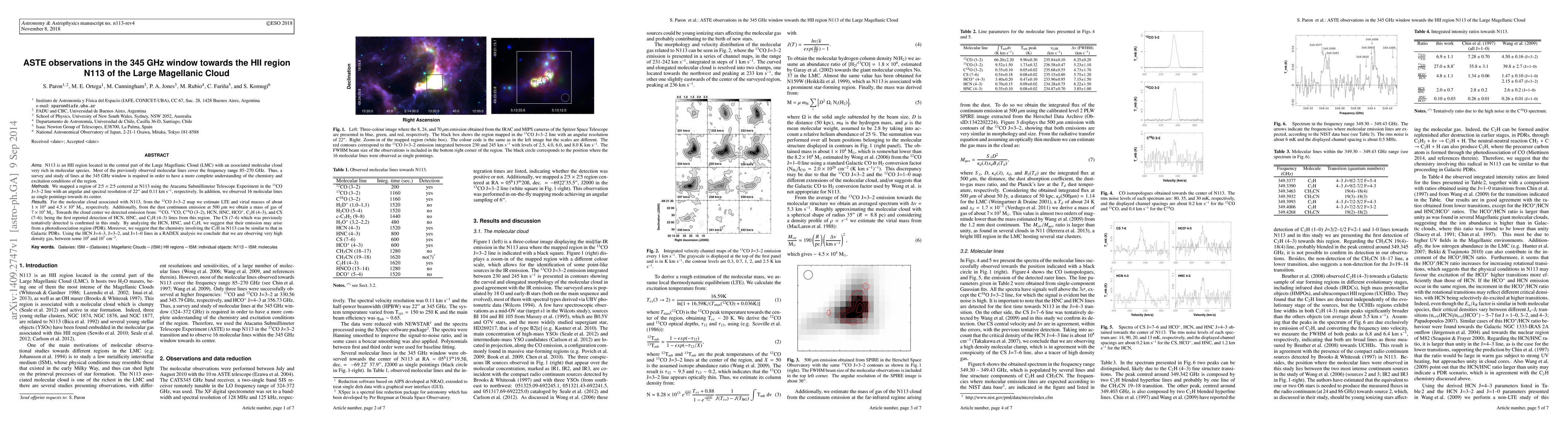 N113 is an HII region located in the central part of the Large Magellanic Cloud (LMC) with an associated molecular cloud very rich in molecular species. Most of the previously observed molecular lines cover the frequency range 85-270 GHz. Thus, a survey and study of lines at the 345 GHz window is required in order to have a more complete understanding of the chemistry and excitation conditions of the region. We mapped a region of 2.5' x 2.5' centered at N113 using the Atacama Submillimeter Telescope Experiment in the 13CO J=3-2 line with an angular and spectral resolution of 22" and 0.11 km/s, respectively. In addition, we observed 16 molecular lines as single pointings towards its center. For the molecular cloud associated with N113, from the 13CO J=3-2 map we estimate LTE and virial masses of about 1x10^4 and 4.5x10^4 M_sun, respectively. Additionally, from the dust continuum emission at 500 micron we obtain a mass of gas of 7x10^3 M_sun. Towards the cloud center we detected emission from: 12CO, 13CO, C18O (3-2), HCN, HNC, HCO+, C2H (4-3), and CS (7-6); being the first reported detection of HCN, HNC, and C2H (4-3) lines from this region. The CS (7-6) which was previously tentatively detected is confirmed in this study. By analyzing the HCN, HNC, and C2H, we suggest that their emission may arise from a photodissociation region (PDR). Moreover, we suggest that the chemistry involving the C2H in N113 can be similar to that in Galactic PDRs. Using the HCN J=4-3, J=3-2, and J=1-0 lines in a RADEX analysis we conclude that we are observing very high density gas, between some 10^5 and 10^7 cm-3.