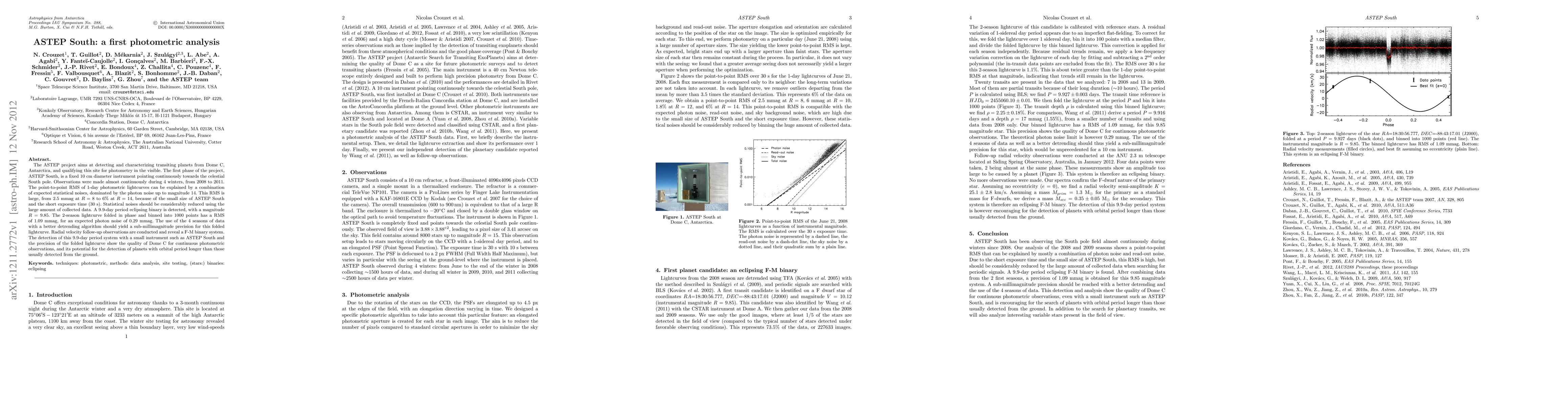 The ASTEP South project, a 10 cm diameter telescope at Dome C, Antarctica, continuously observed the celestial South pole for 4 winters (2008-2011) to detect transiting planets and assess the site's photometric quality. Data was collected using a CCD camera with 30-second exposures, and a custom photometric algorithm was developed to handle elongated point spread functions (PSFs) caused by star rotation on the CCD.