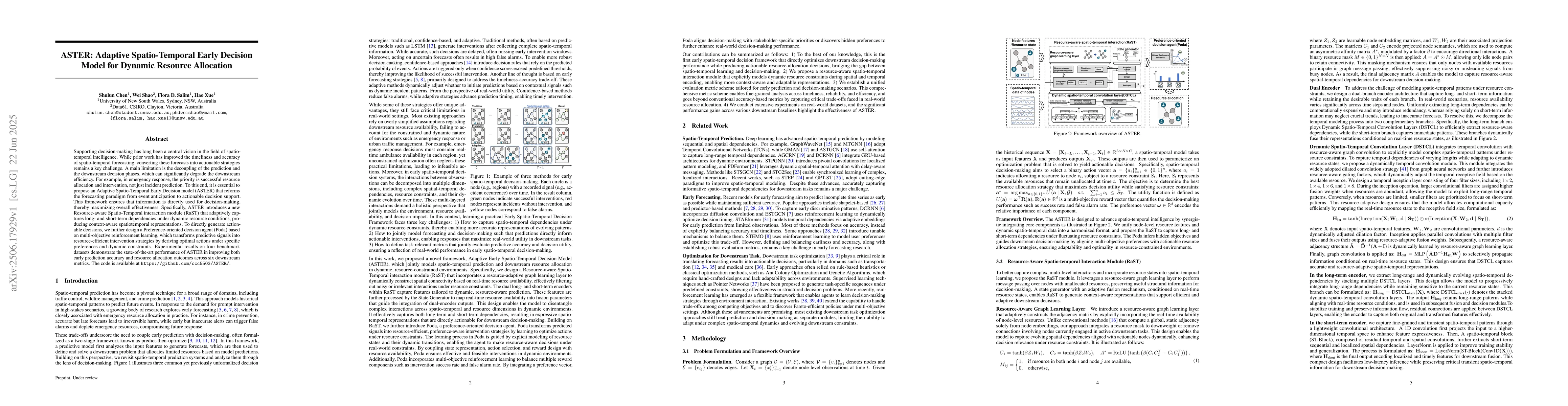 Supporting decision-making has long been a central vision in the field of spatio-temporal intelligence. While prior work has improved the timeliness and accuracy of spatio-temporal forecasting, converting these forecasts into actionable strategies remains a key challenge. A main limitation is the decoupling of the prediction and the downstream decision phases, which can significantly degrade the downstream efficiency. For example, in emergency response, the priority is successful resource allocation and intervention, not just incident prediction. To this end, it is essential to propose an Adaptive Spatio-Temporal Early Decision model (ASTER) that reforms the forecasting paradigm from event anticipation to actionable decision support. This framework ensures that information is directly used for decision-making, thereby maximizing overall effectiveness. Specifically, ASTER introduces a new Resource-aware Spatio-Temporal interaction module (RaST) that adaptively captures long- and short-term dependencies under dynamic resource conditions, producing context-aware spatiotemporal representations. To directly generate actionable decisions, we further design a Preference-oriented decision agent (Poda) based on multi-objective reinforcement learning, which transforms predictive signals into resource-efficient intervention strategies by deriving optimal actions under specific preferences and dynamic constraints. Experimental results on four benchmark datasets demonstrate the state-of-the-art performance of ASTER in improving both early prediction accuracy and resource allocation outcomes across six downstream metrics.