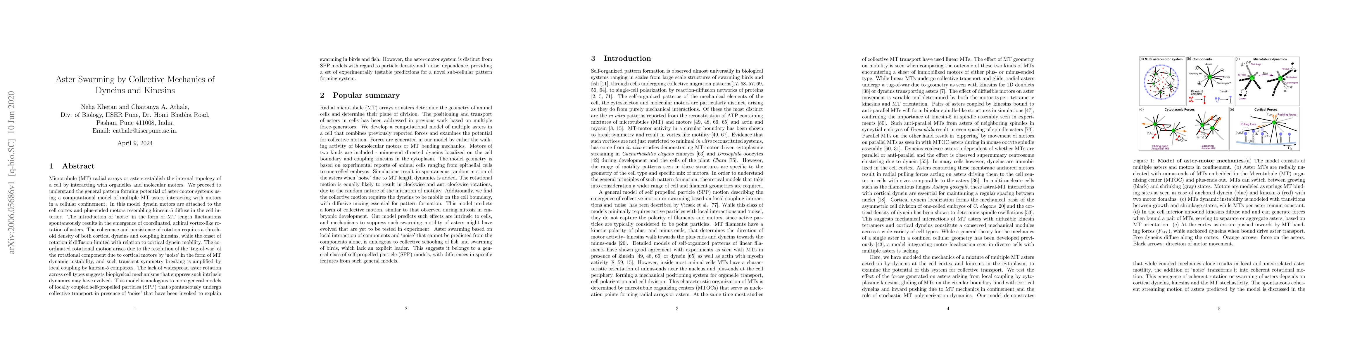 This research presents a computational model of microtubule (MT) asters interacting with motors in a cell, revealing that 'noise' in MT length fluctuations can spontaneously generate coordinated, vortex-like rotation of asters. This motion requires a threshold density of both cortical dyneins and coupling kinesins, and the model is analogous to swarming behaviors in animals, offering experimentally testable predictions for a novel sub-cellular pattern forming system.
