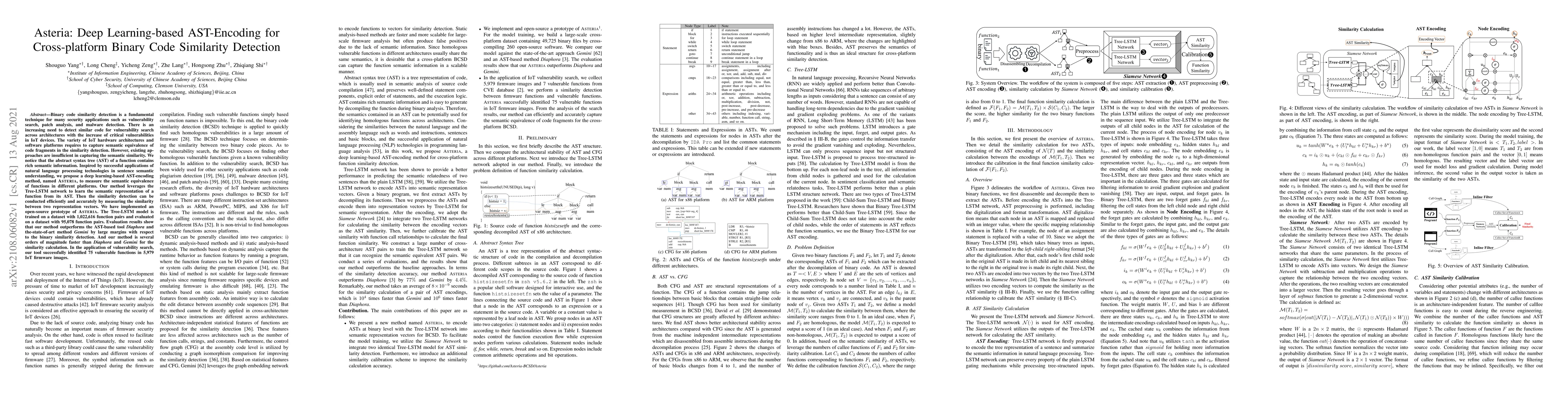 ASTERIA proposes a deep learning-based AST-encoding method using Tree-LSTM networks to capture semantic equivalence of binary code across different platforms, significantly improving accuracy and efficiency over existing tools in binary similarity detection and vulnerability search. The method outperforms Diaphora and Gemini, identifying 75 vulnerable functions in IoT firmware images.