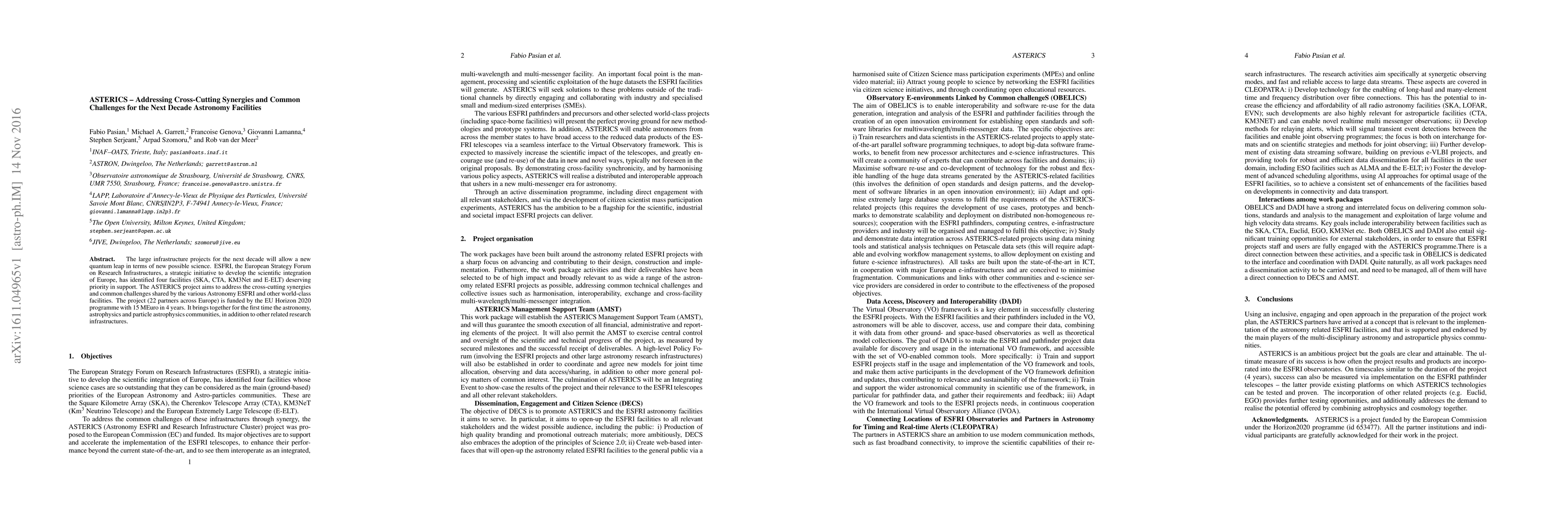 The ASTERICS project, funded by the EU Horizon 2020 programme, aims to address synergies and challenges among major astronomy facilities like SKA, CTA, KM3Net, and E-ELT. It unites diverse scientific communities to foster scientific integration and innovation.