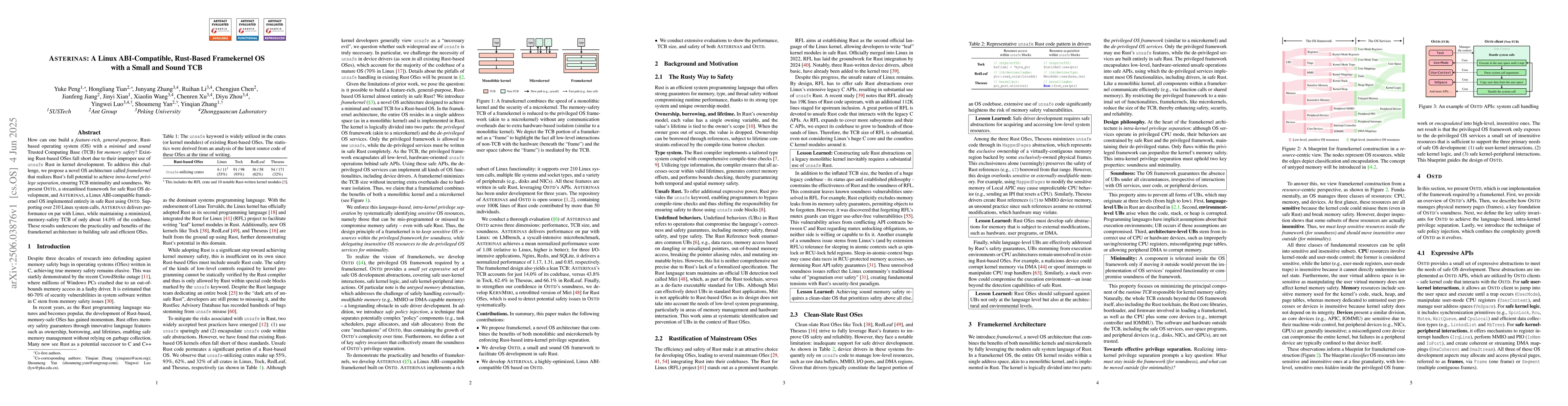 Asterinas is a Linux ABI-compatible OS built with safe Rust, achieving performance similar to Linux while minimizing its Trusted Computing Base to 14% of the codebase.