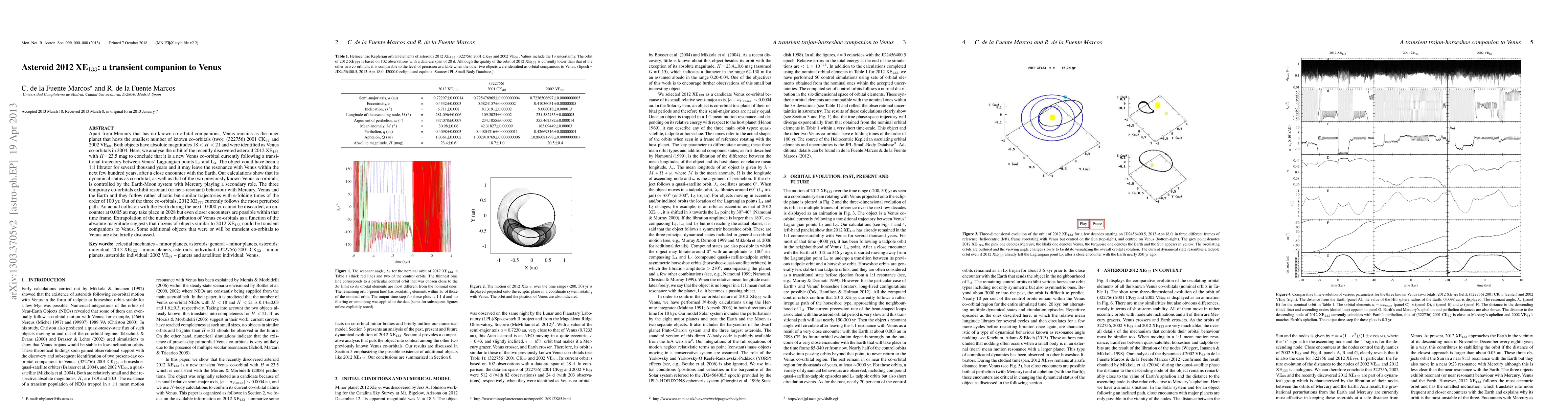 Asteroid 2012 XE133 is a transient companion to Venus, following a transitional trajectory between its Lagrangian points, with a high chance of collision with Earth within the next 10,000 years.