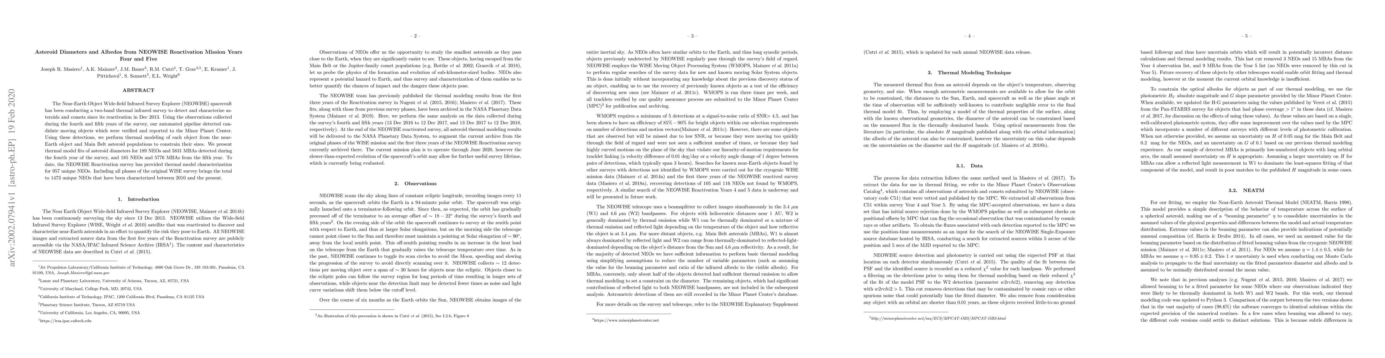 The NEOWISE Reactivation Mission detected and characterized asteroids using thermal infrared observations, providing diameters and albedos for 189 near-Earth objects (NEOs) and 5831 Main Belt asteroids (MBAs) in the fourth year, and 185 NEOs and 5776 MBAs in the fifth year. To date, 957 unique NEOs have been characterized, with a total of 1473 NEOs characterized since 2010.