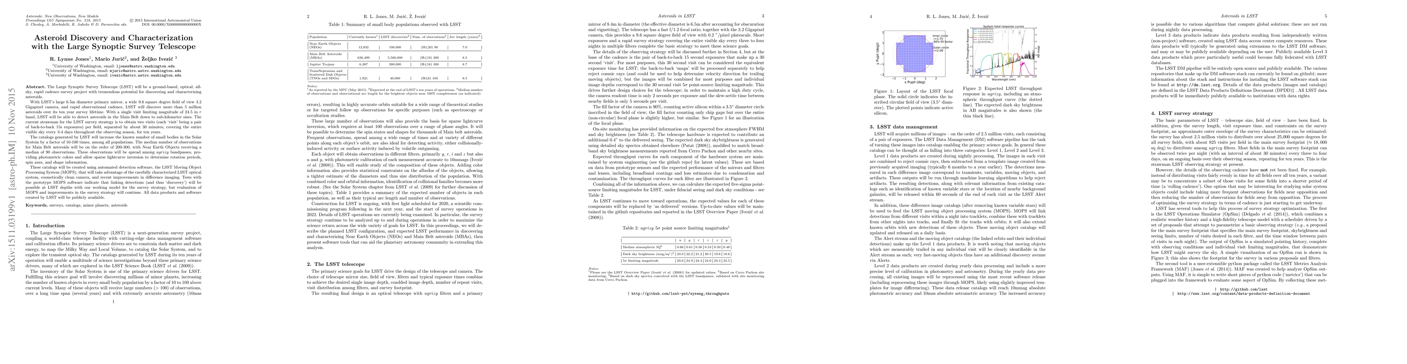 The Large Synoptic Survey Telescope (LSST) aims to discover and characterize over 5 million asteroids using its large optical system and rapid survey cadence. LSST's extensive survey will increase the known population of small Solar System bodies by 10-100 times, providing detailed photometric and rotational data for asteroids.