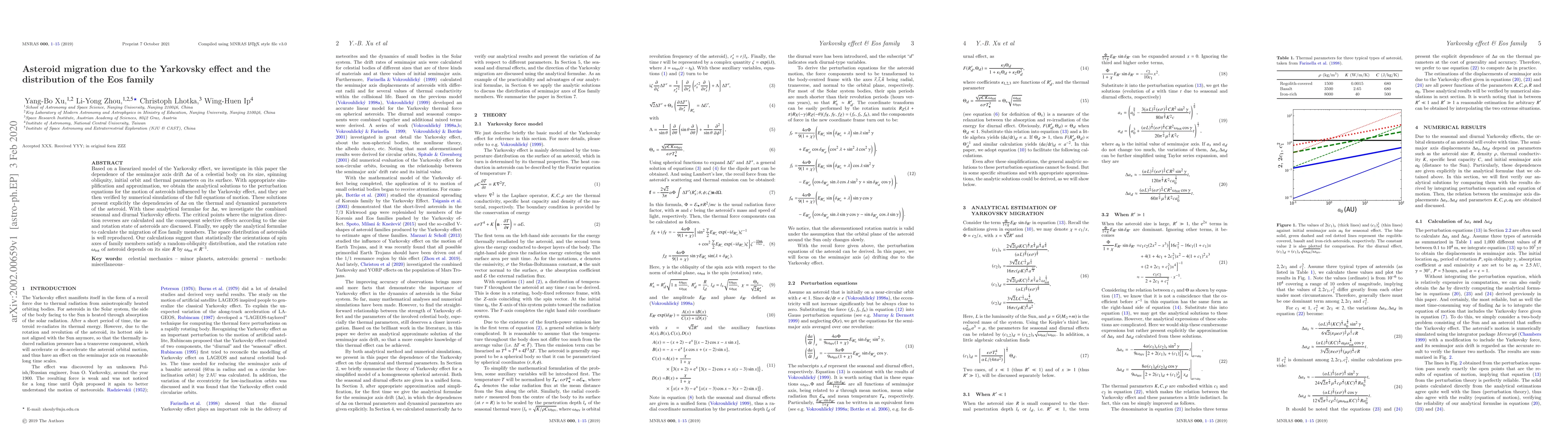This paper investigates asteroid migration due to the Yarkovsky effect, deriving analytical solutions for semimajor axis drift $\Delta a$ based on size, spin, and thermal parameters. It applies these solutions to the Eos family, showing good agreement with the observed distribution and suggesting a random-obliquity distribution for family members' spin axes.