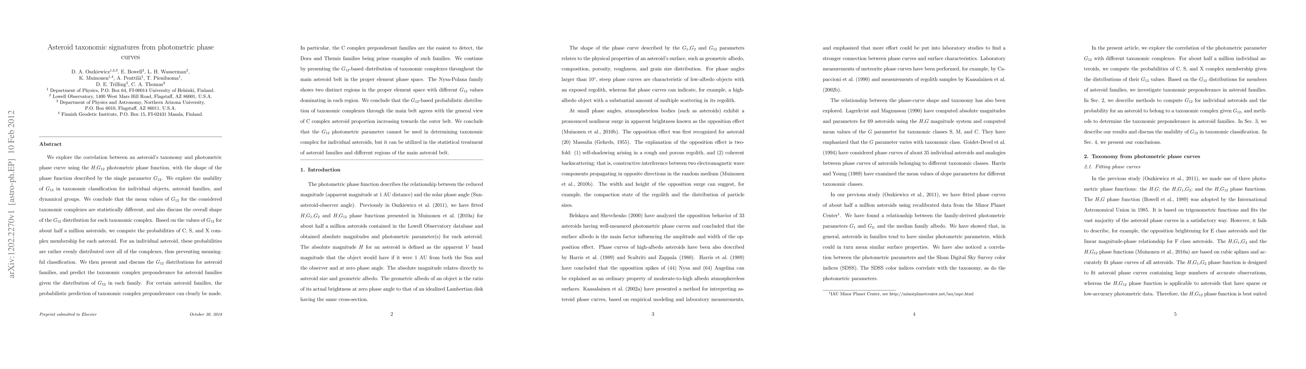 This paper investigates the correlation between asteroid taxonomy and photometric phase curves using the G12 parameter. It finds that while G12 cannot classify individual asteroids, it effectively predicts taxonomic complexes for asteroid families and regions within the main belt, showing a statistical difference in mean G12 values across taxonomic groups.