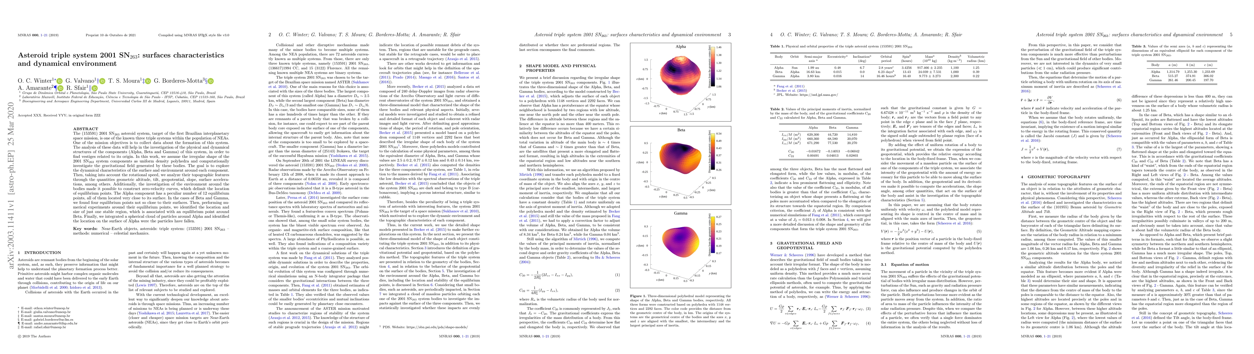 The (153591) 2001 SN263 asteroid system, target of the first Brazilian interplanetary space mission, is one of the known three triple systems within the population of NEAs. One of the mission objectives is to collect data about the formation of this system. The analysis of these data will help in the investigation of the physical and dynamical structures of the components (Alpha, Beta and Gamma) of this system, in order to find vestiges related to its origin. In this work, we assume the irregular shape of the 2001 SN263 system components as uniform density polyhedra and computationally investigate the gravitational field generated by these bodies. The goal is to explore the dynamical characteristics of the surface and environment around each component. Then, taking into account the rotational speed, we analyze their topographic features through the quantities geometric altitude, tilt, geopotential, slope, surface accelerations, among others. Additionally, the investigation of the environment around the bodies made it possible to construct zero-velocity curves, which delimit the location of equilibrium points. The Alpha component has a peculiar number of 12 equilibrium points, all of them located very close to its surface. In the cases of Beta and Gamma, we found four equilibrium points not so close to their surfaces. Then, performing numerical experiments around their equilibrium points, we identified the location and size of just one stable region, which is associated with an equilibrium point around Beta. Finally, we integrated a spherical cloud of particles around Alpha and identified the location on the surface of Alpha were the particles have fallen.