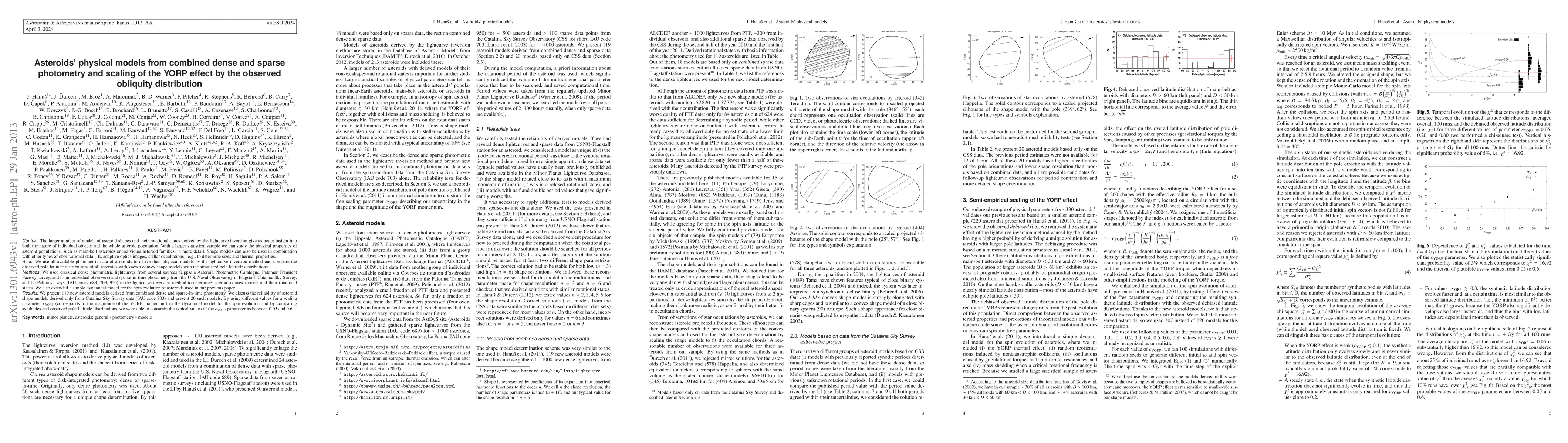 This paper develops new physical models for asteroids using combined dense and sparse photometric data, enhancing insights into asteroid shapes and rotational states. The study also scales the YORP effect based on observed obliquity distributions, constraining the cYORP parameter to values between 0.05 and 0.6.
