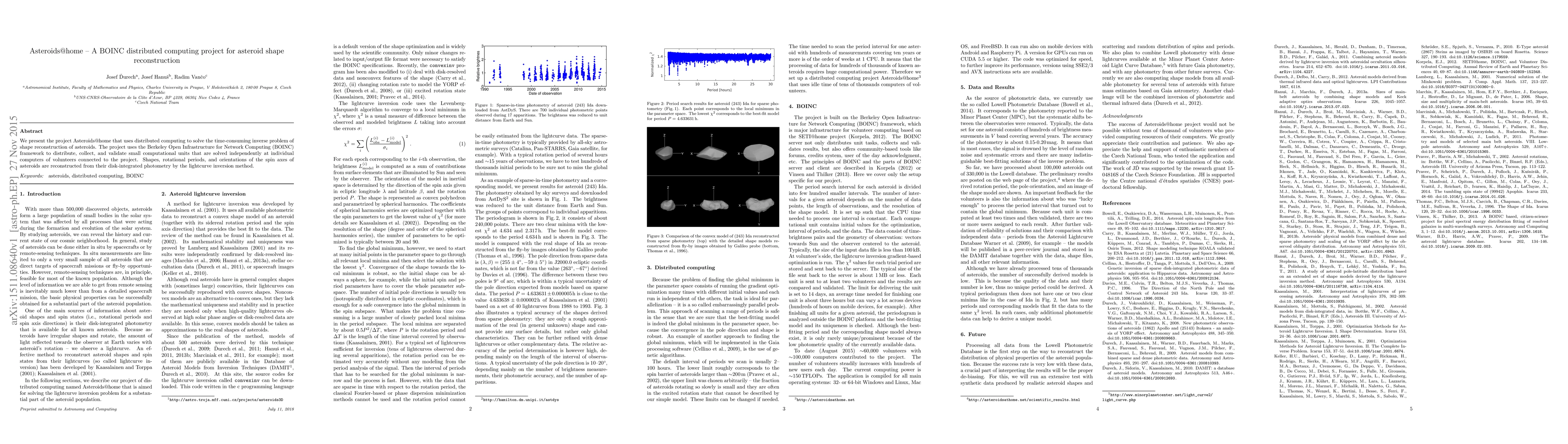 Asteroids@home leverages distributed computing via the BOINC framework to reconstruct asteroid shapes, rotational periods, and spin axes from disk-integrated photometry. Volunteers' computers contribute small computational tasks to solve the inverse problem, enhancing the understanding of asteroid physical characteristics.