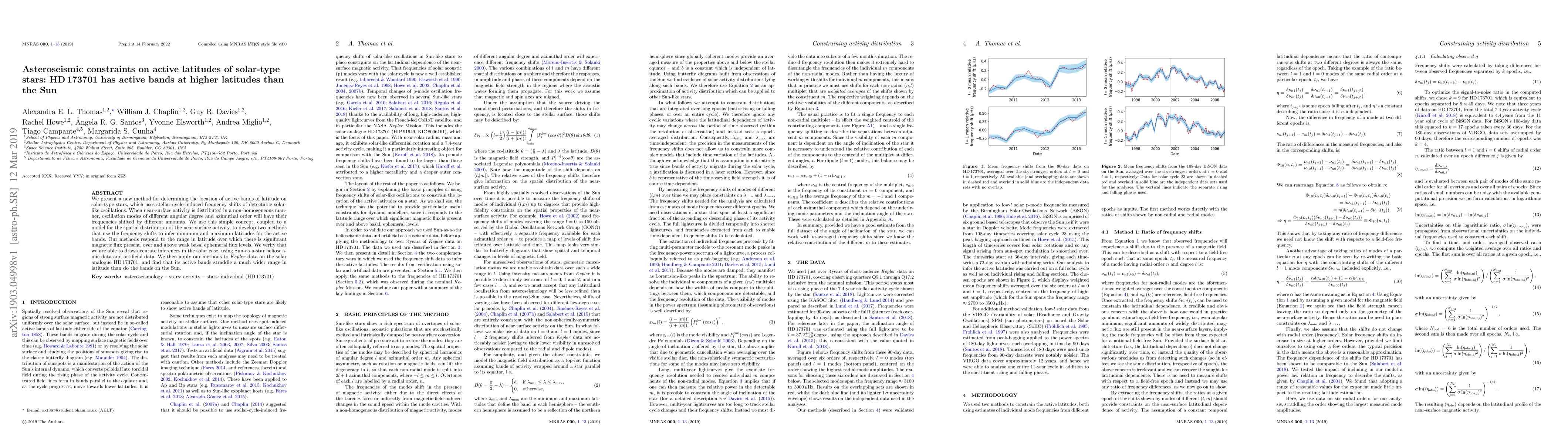 We present a new method for determining the location of active bands of latitude on solar-type stars, which uses stellar-cycle-induced frequency shifts of detectable solar-like oscillations. When near-surface activity is distributed in a non-homogeneous manner, oscillation modes of different angular degree and azimuthal order will have their frequencies shifted by different amounts. We use this simple concept, coupled to a model for the spatial distribution of the near-surface activity, to develop two methods that use the frequency shifts to infer minimum and maximum latitudes for the active bands. Our methods respond to the range in latitude over which there is significant magnetic flux present, over and above weak basal ephemeral flux levels. We verify that we are able to draw accurate inferences in the solar case, using Sun-as-a-star helioseismic data and artificial data. We then apply our methods to Kepler data on the solar analogue HD173701, and find that its active bands straddle a much wider range in latitude than do the bands on the Sun.