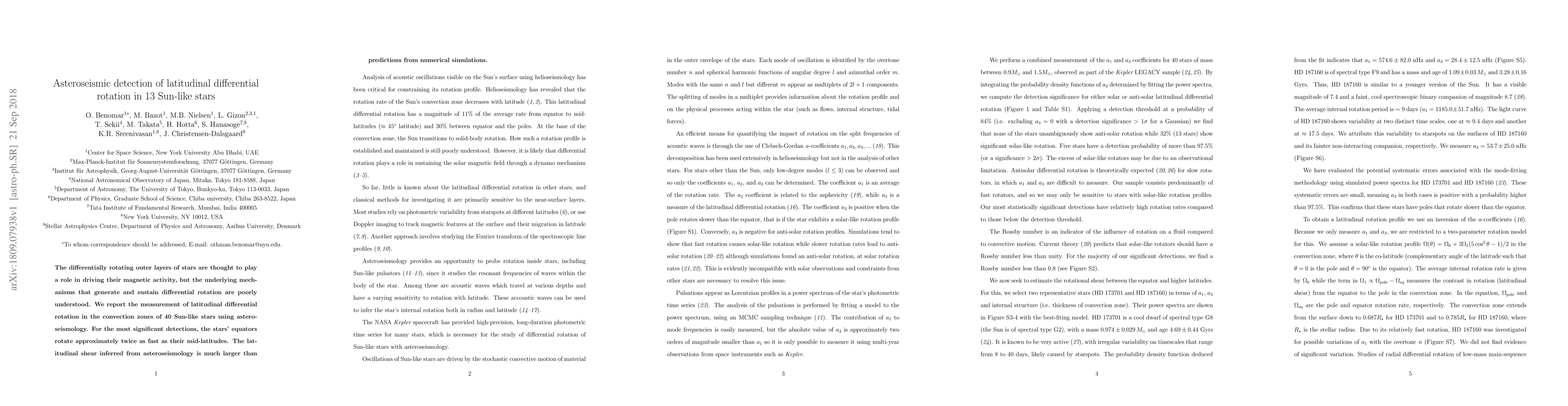 This study uses asteroseismology to detect latitudinal differential rotation in 40 Sun-like stars, revealing that their equators rotate about twice as fast as mid-latitudes. The observed shear is significantly greater than predicted by current simulations, highlighting gaps in our understanding of stellar magnetic activity mechanisms.