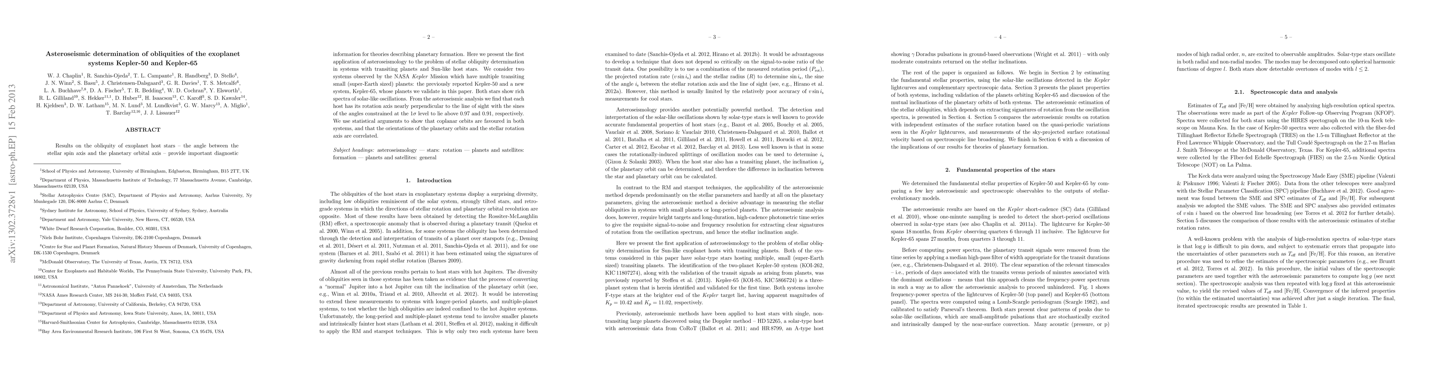 This paper uses asteroseismology to determine the obliquities of exoplanet host stars Kepler-50 and Kepler-65, revealing that both stars' rotation axes are nearly perpendicular to the line of sight, with high confidence. The analysis supports coplanar orbits and suggests a correlation between planetary orbits and stellar rotation axes.