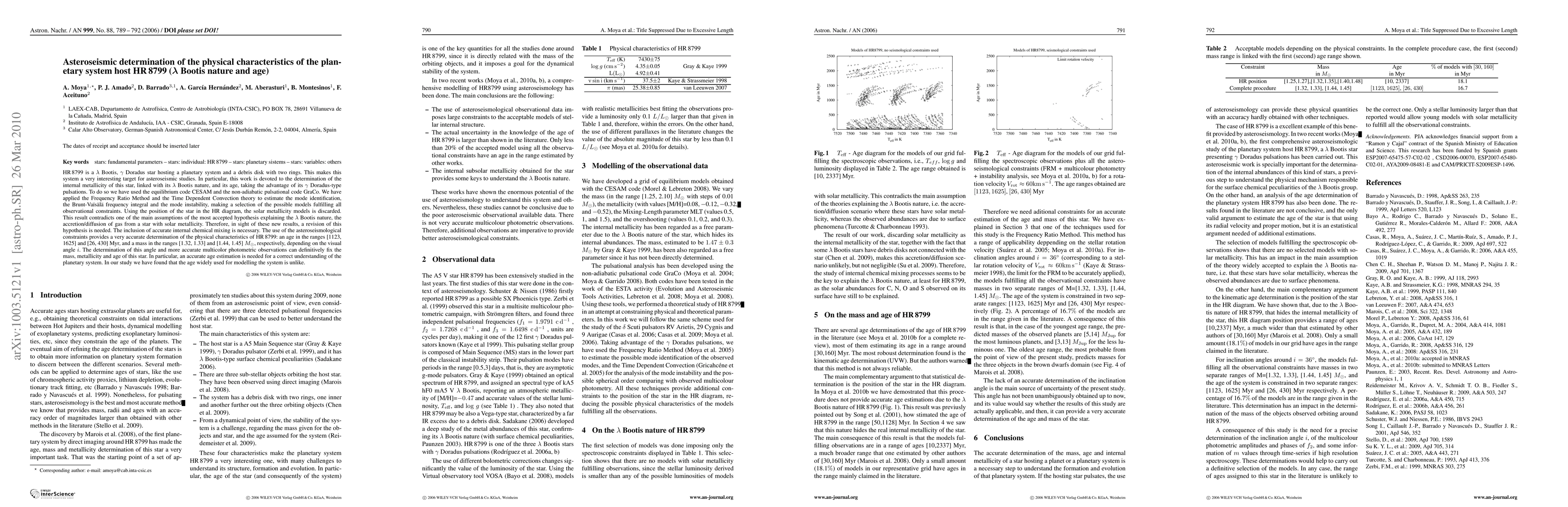 HR\,8799 is a $\lambda$ Bootis, $\gamma$ Doradus star hosting a planetary system and a debris disk with two rings. This makes this system a very interesting target for asteroseismic studies. In particular, this work is devoted to the determination of the internal metallicity of this star, linked with its $\lambda$ Bootis nature, and its age, taking the advantage of its $\gamma$ Doradus-type pulsations. To do so we have used the equilibrium code CESAM and the non-adiabatic pulsational code GraCo. We have applied the Frequency Ratio Method and the Time Dependent Convection theory to estimate the mode identification, the Brunt-Va\"is\"al\"a frequency integral and the mode instability, making a selection of the possible models fulfilling all observational constraints. Using the position of the star in the HR diagram, the solar metallicity models is discarded. This result contradicts one of the main assumptions of the most accepted hypothesis explaining the $\lambda$ Bootis nature, the accretion/diffusion of gas from a star with solar metallicity. Therefore, in sight of these new results, a revision of this hypothesis is needed. The inclusion of accurate internal chemical mixing is necessary. The use of the asteroseismological constraints provides a very accurate determination of the physical characteristics of HR\,8799: an age in the ranges [1123, 1625] and [26, 430] Myr, and a mass in the ranges [1.32, 1.33] and [1.44, 1.45] $M_{\odot}$, respectively, depending on the visual angle $i$. The determination of this angle and more accurate multicolor photometric observations can definitively fix the mass, metallicity and age of this star. In particular, an accurate age estimation is needed for a correct understanding of the planetary system. In our study we have found that the age widely used for modelling the system is unlike.