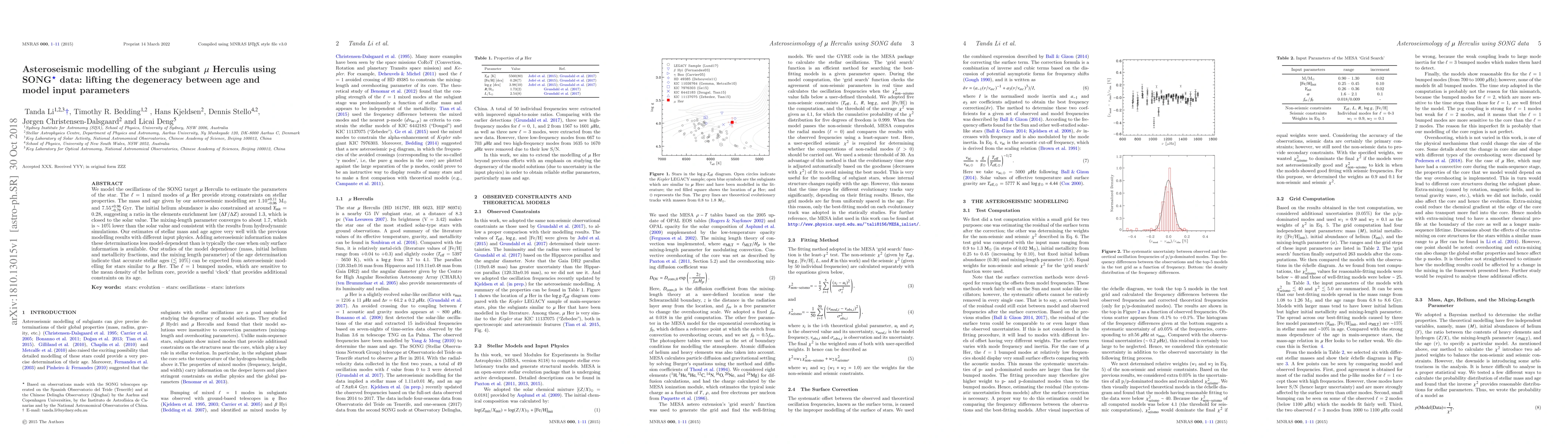 We model the oscillations of the SONG target $\mu$ Herculis to estimate the parameters of the star. The $\ell$ = 1 mixed modes of $\mu$ Her provide strong constraints on stellar properties. The mass and age given by our asteroseismic modelling are 1.10$^{+0.11}_{-0.06}$ M$_{\odot}$ and 7.55$^{+0.96}_{-0.79}$ Gyr. The initial helium abundance is also constrained at around $Y_{\rm{init}}$ = 0.28, suggesting a ratio in the elements enrichment law ($\Delta Y/\Delta Z$) around 1.3, which is closed to the solar value. The mixing-length parameter converges to about 1.7, which is $\sim$ 10\% lower than the solar value and consistent with the results from hydrodynamic simulations. Our estimates of stellar mass and age agree very well with the previous modelling results with different input physics. Adding asteroseismic information makes these determinations less model-dependent than is typically the case when only surface information is available. Our studies of the model dependence (mass, initial helium and metallicity fractions, and the mixing length parameter) of the age determination indicate that accurate stellar ages ($\lesssim$ 10\%) can be expected from asteroseismic modelling for stars similar to $\mu$ Her. The $\ell$ = 1 bumped modes, which are sensitive to the mean density of the helium core, provide a useful 'clock' that provides additional constraints on its age.