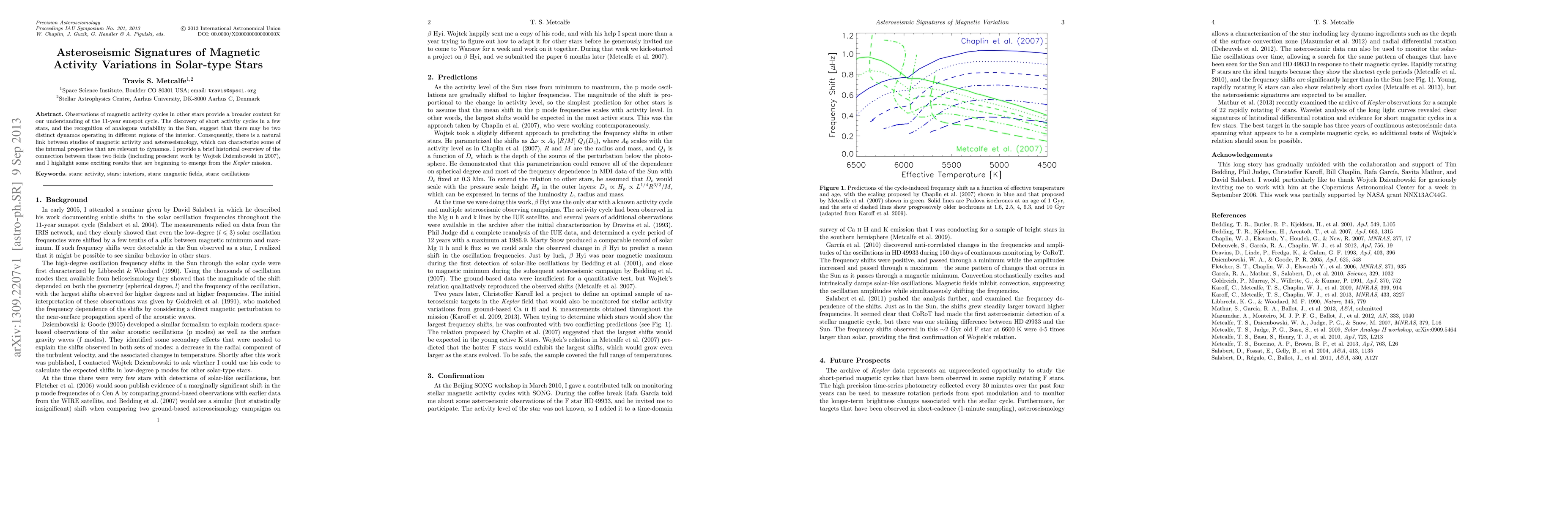Observations of magnetic activity cycles in other stars provide a broader context for our understanding of the 11-year sunspot cycle. The discovery of short activity cycles in a few stars, and the recognition of analogous variability in the Sun, suggest that there may be two distinct dynamos operating in different regions of the interior. Consequently, there is a natural link between studies of magnetic activity and asteroseismology, which can characterize some of the internal properties that are relevant to dynamos. I provide a brief historical overview of the connection between these two fields (including prescient work by Wojtek Dziembowski in 2007), and I highlight some exciting results that are beginning to emerge from the Kepler mission.