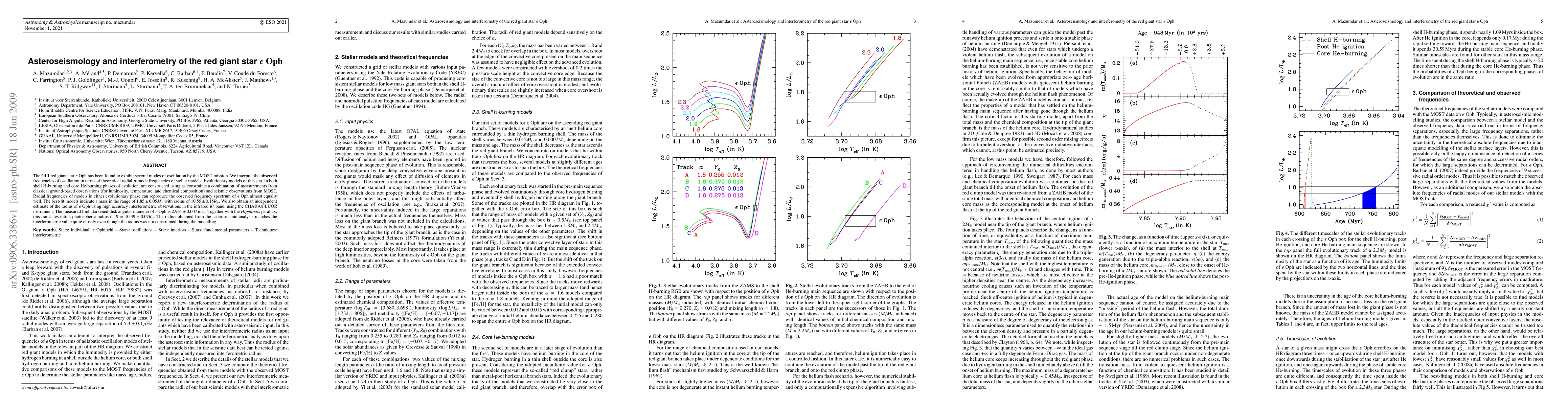 This paper combines asteroseismic and interferometric data to study the red giant star epsilon Oph, revealing its oscillation modes and constructing evolutionary models. The best-fit models suggest a mass of 1.85 +/- 0.05 Msun and a radius of 10.55 +/- 0.15 Rsun, which closely matches the radius obtained from interferometric observations of 10.39 +/- 0.07 Rsun.