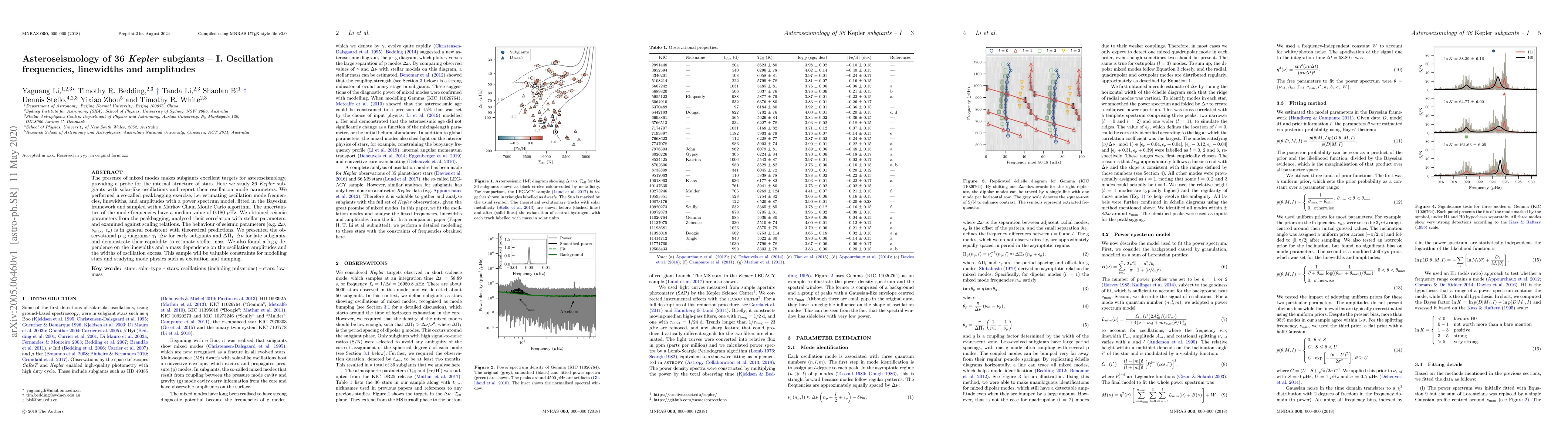 This paper investigates 36 Kepler subgiants with solar-like oscillations, determining their oscillation mode frequencies, linewidths, and amplitudes using a Bayesian framework and MCMC algorithm. The study finds the seismic parameters generally align with theoretical predictions and provides valuable observational diagrams for estimating stellar mass and understanding mode physics.