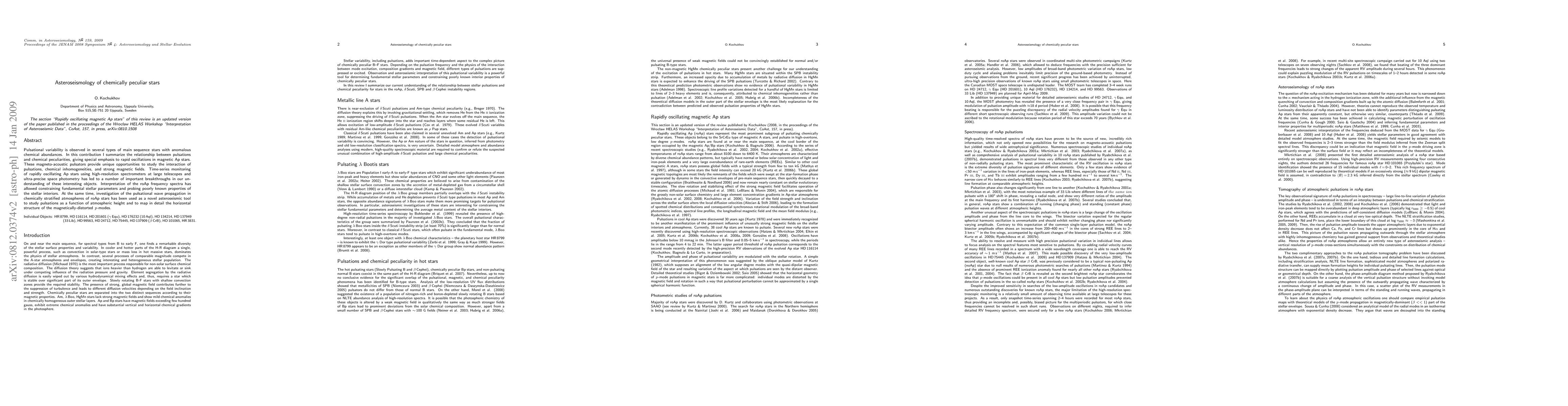 Pulsational variability is observed in several types of main sequence stars with anomalous chemical abundances. In this contribution I summarize the relationship between pulsations and chemical peculiarities, giving special emphasis to rapid oscillations in magnetic Ap stars. These magneto-acoustic pulsators provide unique opportunities to study the interaction of pulsations, chemical inhomogeneities, and strong magnetic fields. Time-series monitoring of rapidly oscillating Ap stars using high-resolution spectrometers at large telescopes and ultra-precise space photometry has led to a number of important breakthroughs in our understanding of these interesting objects. Interpretation of the roAp frequency spectra has allowed constraining fundamental stellar parameters and probing poorly known properties of the stellar interiors. At the same time, investigation of the pulsational wave propagation in chemically stratified atmospheres of roAp stars has been used as a novel asteroseismic tool to study pulsations as a function of atmospheric height and to map in detail the horizontal structure of the magnetically-distorted p-modes.