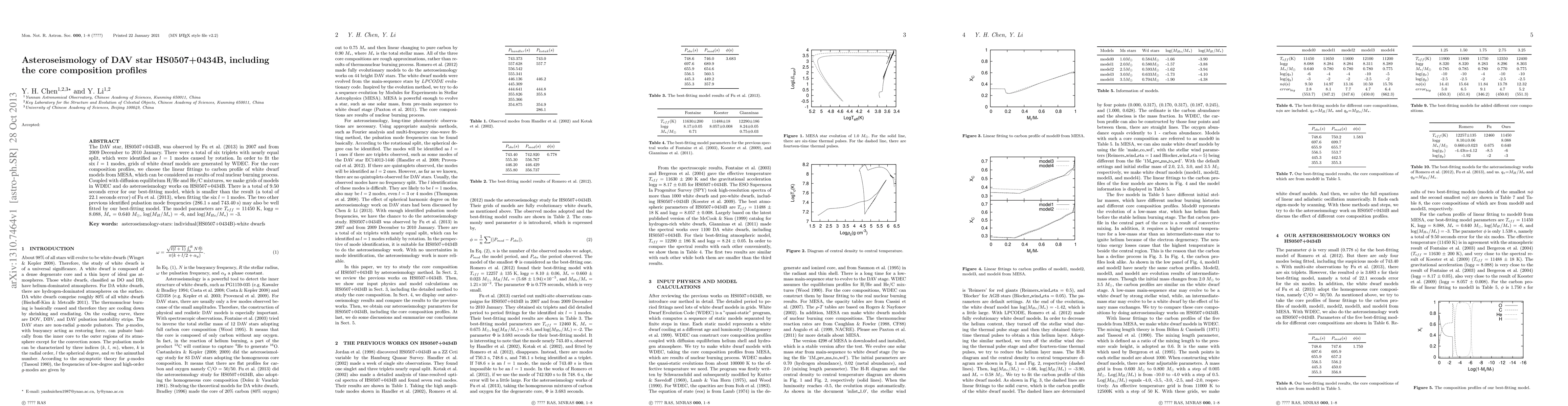 The DAV star, HS0507+0434B, was observed by Fu et al. (2013) in 2007 and from 2009 December to 2010 January. There were a total of six triplets with nearly equal split, which were identified as $l$ = 1 modes caused by rotation. In order to fit the six $l$ = 1 modes, grids of white dwarf models are generated by WDEC. For the core composition profiles, we choose the linear fittings to carbon profile of white dwarf models from MESA, which can be considered as results of real nuclear burning process. Coupled with diffusion equilibrium H/He and He/C mixtures, we make grids of models in WDEC and do asteroseismology works on HS0507+0434B. There is a total of 9.50 seconds error for our best-fitting model, which is smaller than the result (a total of 22.1 seconds error) of Fu et al. (2013), when fitting the six $l$ = 1 modes. The two other previous identified pulsation mode frequencies (286.1 s and 743.40 s) may also be well fitted by our best-fitting model. The model parameters are $T_{eff}$ = 11450 K, log$g$ = 8.088, $M_{*}$ = 0.640 $M_{\odot}$, log($M_{H}$/$M_{*}$) = -6, and log($M_{He}$/$M_{*}$) = -3.