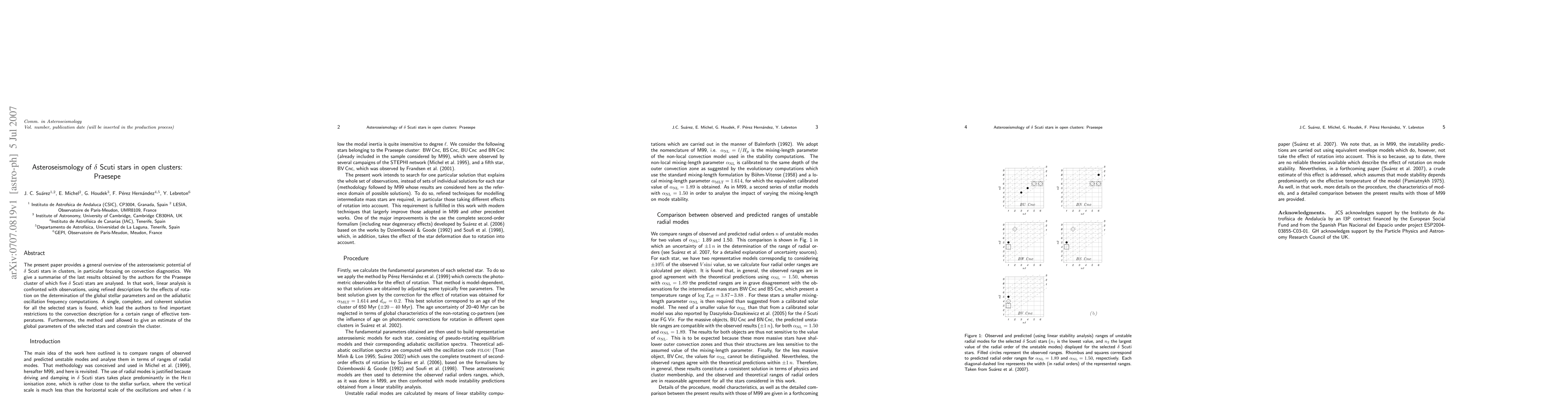 The present paper provides a general overview of the asteroseismic potential of delta Scuti stars in clusters, in particular focusing on convection diagnostics. We give a summarise of the last results obtained by the authors for the Praesepe cluster of which five delta Scuti stars are analysed. In that work, linear analysis is confronted with observations, using refined descriptions for the effects of rotation on the determination of the global stellar parameters and on the adiabatic oscillation frequency computations. A single, complete, and coherent solution for all the selected stars is found, which lead the authors to find important restrictions to the convection description for a certain range of effective temperatures. Furthermore, the method used allowed to give an estimate of the global parameters of the selected stars and constrain the cluster.