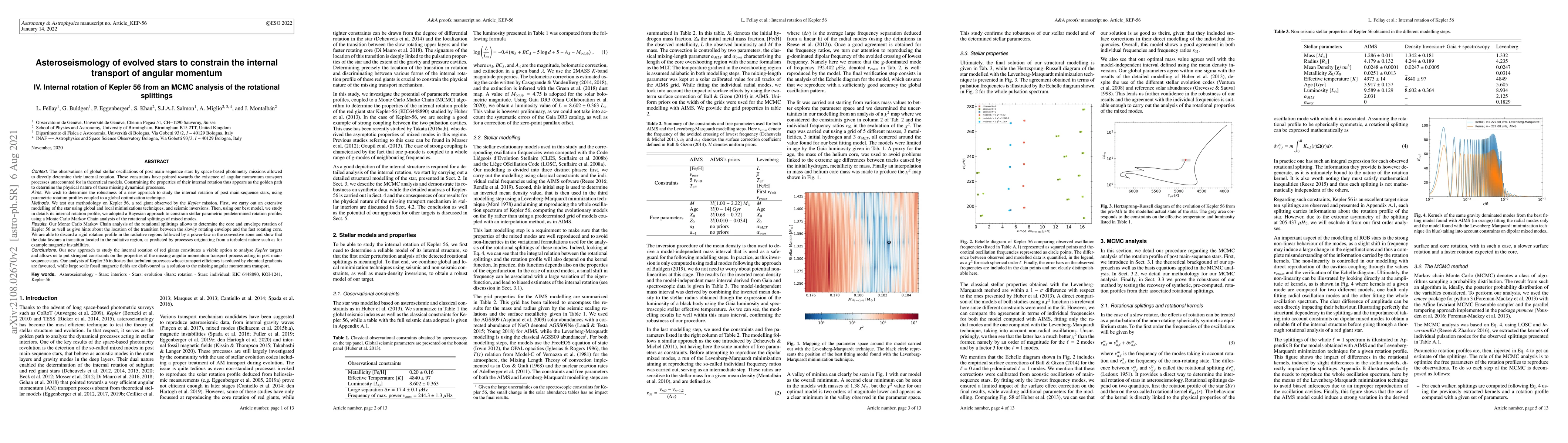 This paper uses asteroseismology to study the internal rotation of the red giant Kepler 56, employing a Bayesian MCMC analysis of its oscillation modes. The findings suggest a transition from a fast-rotating core to a slowly rotating envelope in the radiative region, indicating turbulent processes as the likely angular momentum transport mechanism.