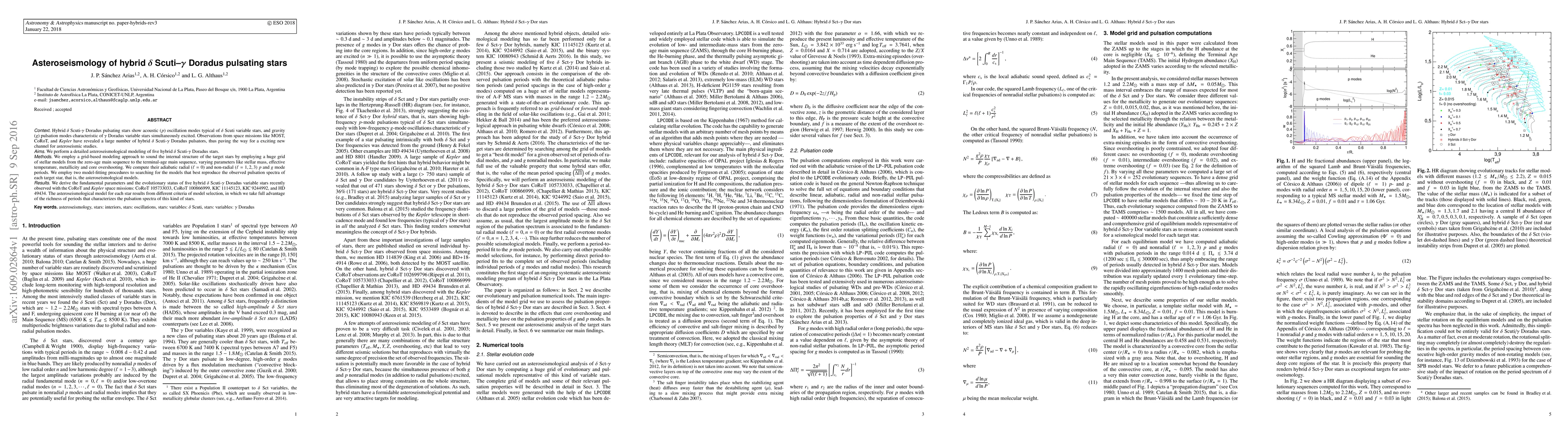 This paper investigates hybrid δ Scuti-γ Doradus pulsating stars using asteroseismology, combining both acoustic and gravity pulsation modes. Detailed modeling of five such stars reveals their internal structure and evolutionary status, employing a grid of stellar models to match observed pulsation periods.