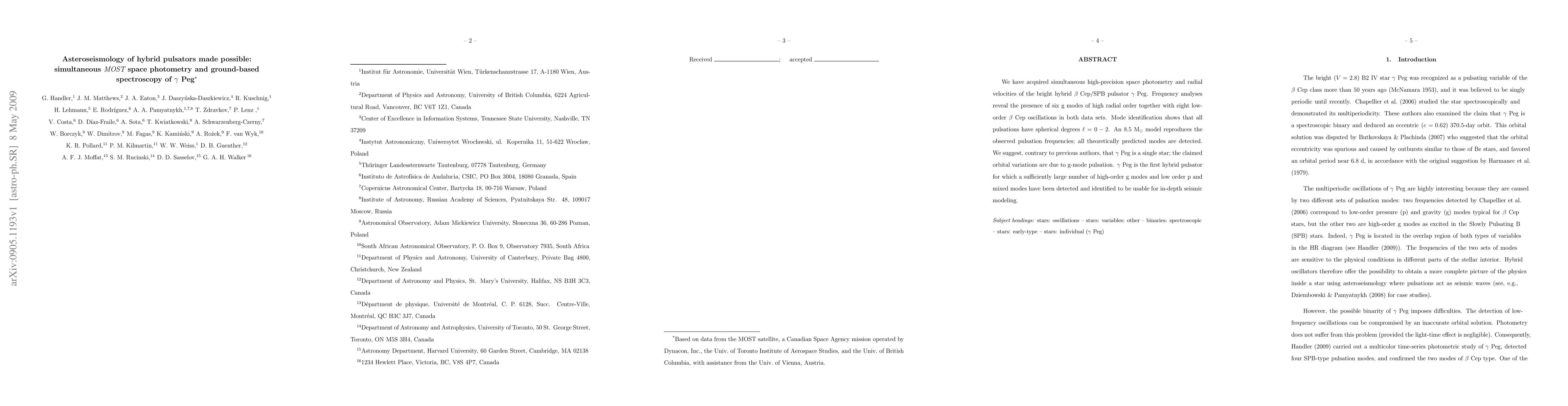 We have acquired simultaneous high-precision space photometry and radial velocities of the bright hybrid Beta Cep/SPB pulsator Gamma Peg. Frequency analyses reveal the presence of six g modes of high radial order together with eight low-order Beta Cep oscillations in both data sets. Mode identification shows that all pulsations have spherical degrees l = 0 - 2. An 8.5 solar mass model reproduces the observed pulsation frequencies; all theoretically predicted modes are detected. We suggest, contrary to previous authors, that Gamma Peg is a single star; the claimed orbital variations are due to g-mode pulsation. Gamma Peg is the first hybrid pulsator for which a sufficiently large number of high-order g modes and low order p and mixed modes have been detected and identified to be usable for in-depth seismic modeling.
