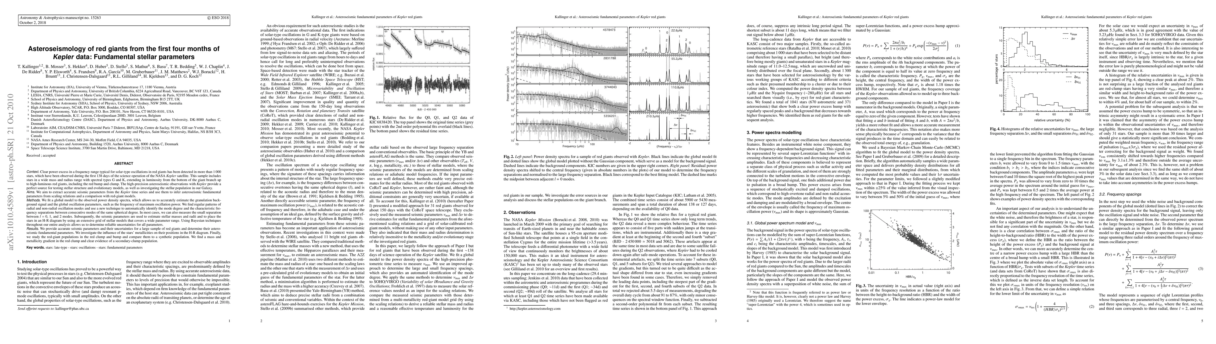 This paper uses Kepler satellite data to detect solar-type oscillations in over 1000 red giants, providing precise asteroseismic parameters for mass, radius, and luminosity. Bayesian techniques yield reliable uncertainties, revealing a mass and metallicity gradient in the red clump and evidence of a secondary-clump population.