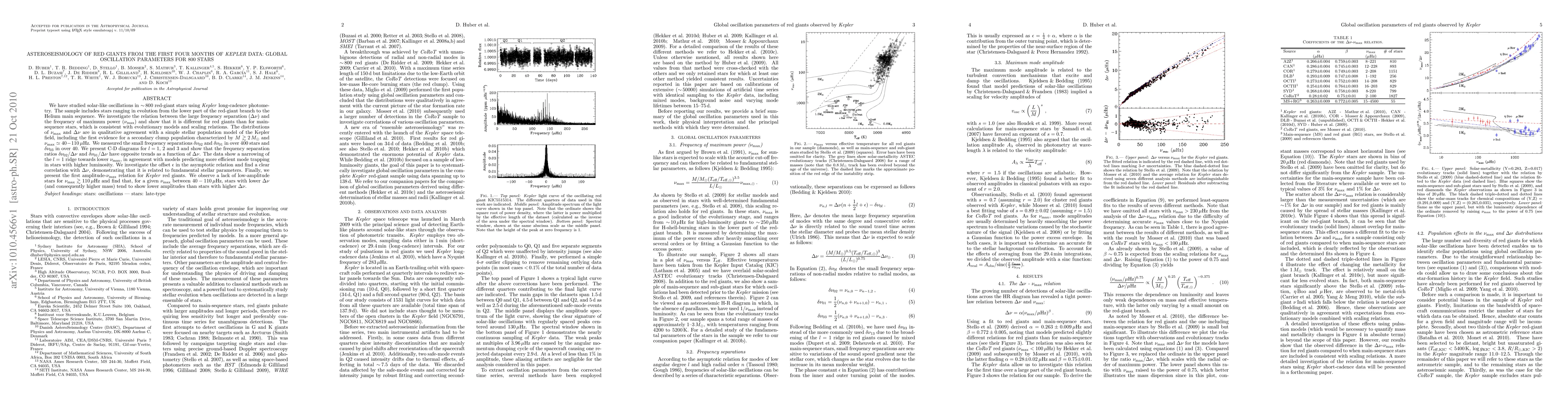 This paper analyzes solar-like oscillations in ~800 red-giant stars observed by Kepler, revealing distinct oscillation parameter relations compared to main-sequence stars and identifying a secondary clump population. It also finds a correlation between the oscillation frequency separation ratios and luminosity, and presents an amplitude-nu_max relation showing lower oscillation amplitudes in higher-mass stars.
