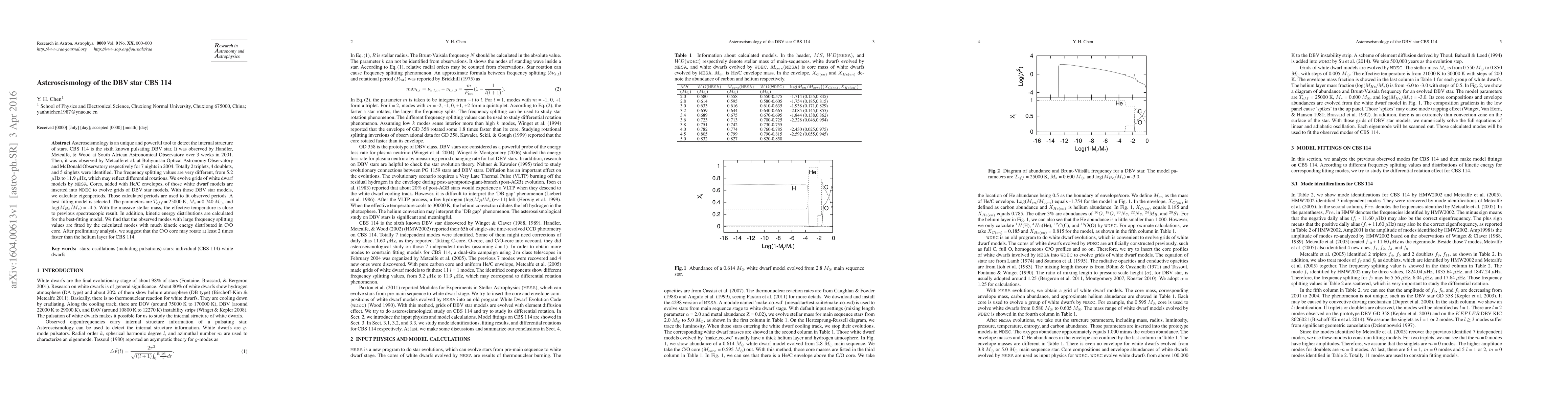 Asteroseismology is an unique and powerful tool to detect the internal structure of stars. CBS 114 is the sixth known pulsating DBV star. It was observed by Handler, Metcalfe, \& Wood at South African Astronomical Observatory over 3 weeks in 2001. Then, it was observed by Metcalfe et al. at Bohyunsan Optical Astronomy Observatory and McDonald Observatory respectively for 7 nights in 2004. Totally 2 triplets, 4 doublets, and 5 singlets were identified. The frequency splitting values are very different, from 5.2 $\mu$Hz to 11.9 $\mu$Hz, which may reflect differential rotations. We evolve grids of white dwarf models by \texttt{MESA}. Cores, added with He/C envelopes, of those white dwarf models are inserted into \texttt{WDEC} to evolve grids of DBV star models. With those DBV star models, we calculate eigenperiods. Those calculated periods are used to fit observed periods. A best-fitting model is selected. The parameters are $T_{eff}$ = 25000 K, $M_{*}$ = 0.740 $M_{\odot}$, and log($M_{He}/M_{*}$) = -4.5. With the massive stellar mass, the effective temperature is close to previous spectroscopic result. In addition, kinetic energy distributions are calculated for the best-fitting model. We find that the observed modes with large frequency splitting values are fitted by the calculated modes with much kinetic energy distributed in C/O core. After preliminary analysis, we suggest that the C/O core may rotate at least 2 times faster than the helium layer for CBS 114.