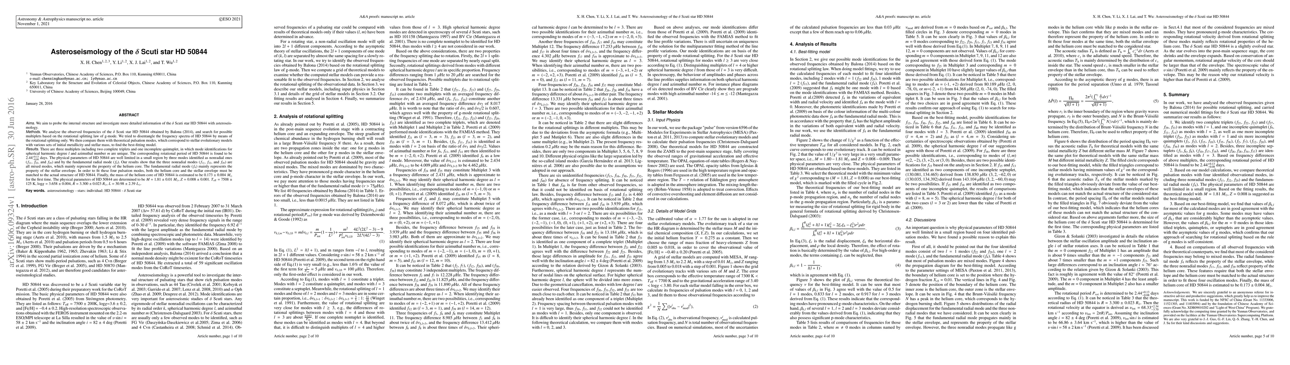 This study uses asteroseismology to analyze the internal structure of the $\delta$ Scuti star HD 50844, identifying three multiplets and determining its rotational period. The analysis reveals the star's physical parameters, including its mass, effective temperature, and luminosity, and estimates the mass of its helium core for the first time.