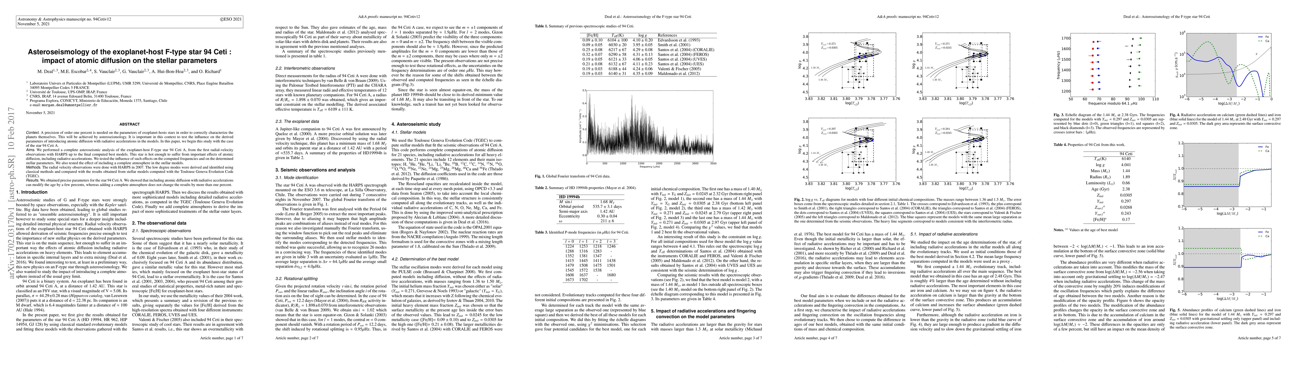 A precision of order one percent is needed on the parameters of exoplanet-hosts stars in order to correctly characterize the planets themselves. This will be achieved by asteroseismology. It is important in this context to test the influence on the derived parameters of introducing atomic diffusion with radiative accelerations in the models. In this paper, we begin this study with the case of the star 94 Ceti A. We performed a complete asteroseismic analysis of the exoplanet-host F-type star 94 Ceti A, from the first radial-velocity observations with HARPS up to the final computed best models. This star is hot enough to suffer from important effects of atomic diffusion, including radiative accelerations. We tested the influence of such effects on the computed frequencies and on the determined stellar parameters. We also tested the effect of including a complete atmosphere in the stellar models. The radial velocity observations were done with HARPS in 2007. The low degree modes were derived and identified using classical methods and compared with the results obtained from stellar models computed with the Toulouse Geneva Evolution Code (TGEC). We obtained precise parameters for the star 94 Ceti A. We showed that including atomic diffusion with radiative accelerations can modify the age by a few percents, whereas adding a complete atmosphere does not change the results by more than one percent.