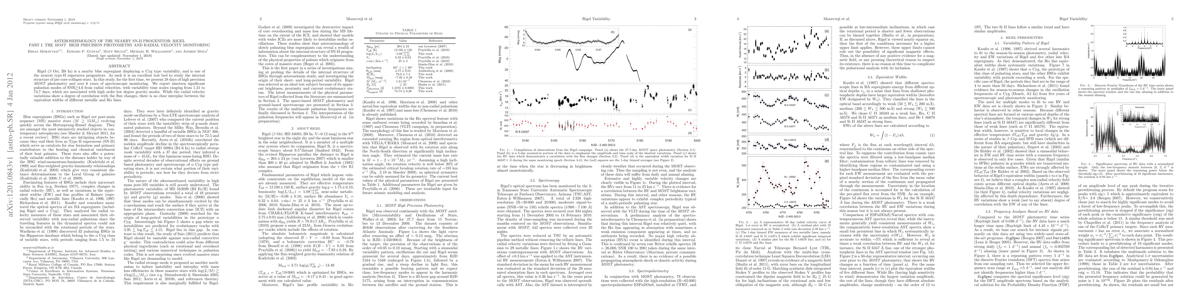 Rigel (beta Ori, B8 Ia) is a nearby blue supergiant displaying alpha Cyg type variability, and is one of the nearest type-II supernova progenitors. As such it is an excellent test bed to study the internal structure of pre core-collapse stars. In this study, for the first time, we present 28 days of high precision MOST photometry and over 6 years of spectroscopic monitoring. We report nineteen significant pulsation modes of SNR>4.6 from radial velocities, with variability time scales ranging from 1.21 to 74.7 days, which are associated with high order low degree gravity modes. While the radial velocity variations show a degree of correlation with the flux changes, there is no clear interplay between the equivalent widths of different metallic and Halpha lines.