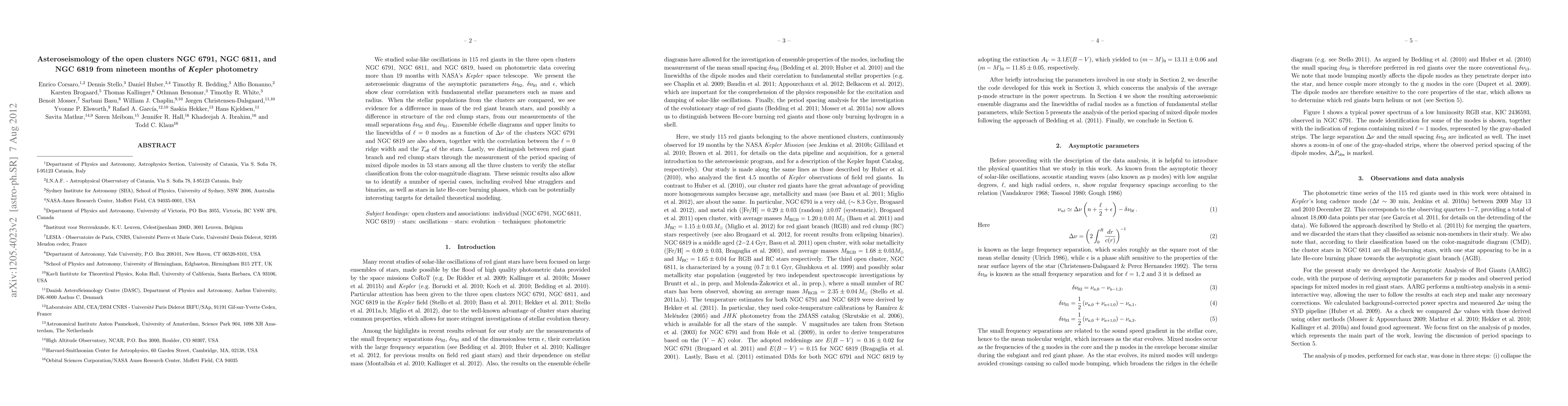 We studied solar-like oscillations in 115 red giants in the three open clusters NGC 6791, NGC 6811, and NGC 6819, based on photometric data covering more than 19 months with NASA's Kepler space telescope. We present the asteroseismic diagrams of the asymptotic parameters \delta\nu_02, \delta\nu_01 and \epsilon, which show clear correlation with fundamental stellar parameters such as mass and radius. When the stellar populations from the clusters are compared, we see evidence for a difference in mass of the red giant branch stars, and possibly a difference in structure of the red clump stars, from our measurements of the small separations \delta\nu_02 and \delta\nu_01. Ensemble \'{e}chelle diagrams and upper limits to the linewidths of l = 0 modes as a function of \Delta\nu of the clusters NGC 6791 and NGC 6819 are also shown, together with the correlation between the l = 0 ridge width and the T_eff of the stars. Lastly, we distinguish between red giant branch and red clump stars through the measurement of the period spacing of mixed dipole modes in 53 stars among all the three clusters to verify the stellar classification from the color-magnitude diagram. These seismic results also allow us to identify a number of special cases, including evolved blue stragglers and binaries, as well as stars in late He-core burning phases, which can be potentially interesting targets for detailed theoretical modeling.