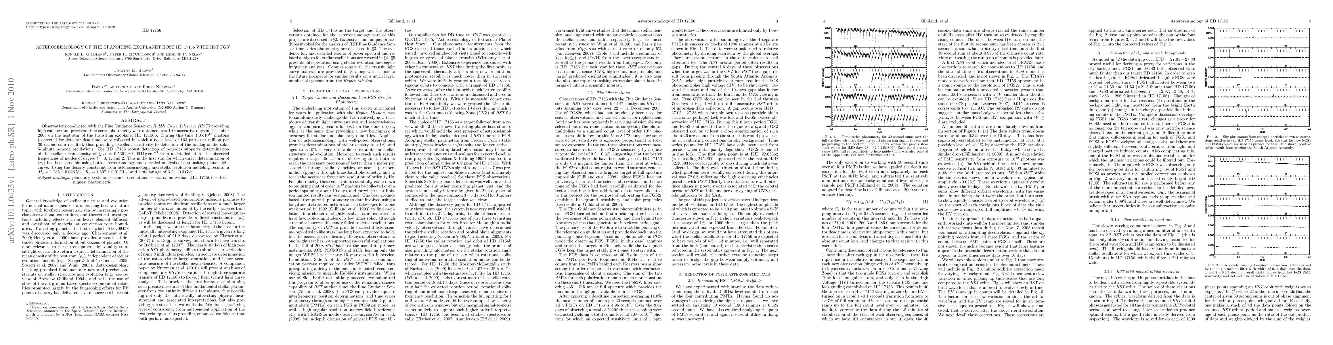 Observations conducted with the Fine Guidance Sensor on Hubble Space Telescope (HST) providing high cadence and precision time-series photometry were obtained over 10 consecutive days in December 2008 on the host star of the transiting exoplanet HD 17156b. During this time 10^12 photons (corrected for detector deadtime) were collected in which a noise level of 163 parts per million per 30 second sum resulted, thus providing excellent sensitivity to detection of the analog of the solar 5-minute p-mode oscillations. For HD 17156 robust detection of p-modes supports determination of the stellar mean density of 0.5301 +/- 0.0044 g/cm^3 from a detailed fit to the observed frequencies of modes of degree l = 0, 1, and 2. This is the first star for which direct determination of the mean stellar density has been possible using both asteroseismology and detailed analysis of a transiting planet light curve. Using the density constraint from asteroseismology, and stellar evolution modeling results in M_star = 1.285 +/- 0.026 solar, R_star = 1.507 +/- 0.012 solar, and a stellar age of 3.2 +/- 0.3 Gyr.