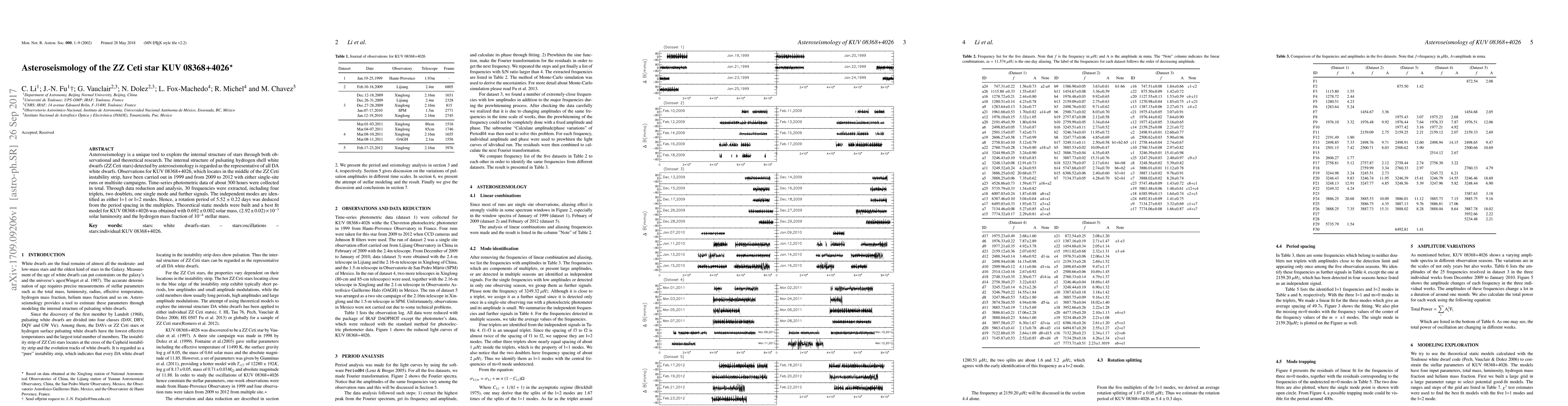 This paper presents asteroseismological observations of the ZZ Ceti star KUV 08368+4026, identifying 30 pulsation frequencies and determining a rotation period of $5.52\pm 0.22$ days. Theoretical models yield a best fit with a mass of $0.692\pm0.002$ solar masses and a hydrogen mass fraction of $10^{-4}$ stellar mass.