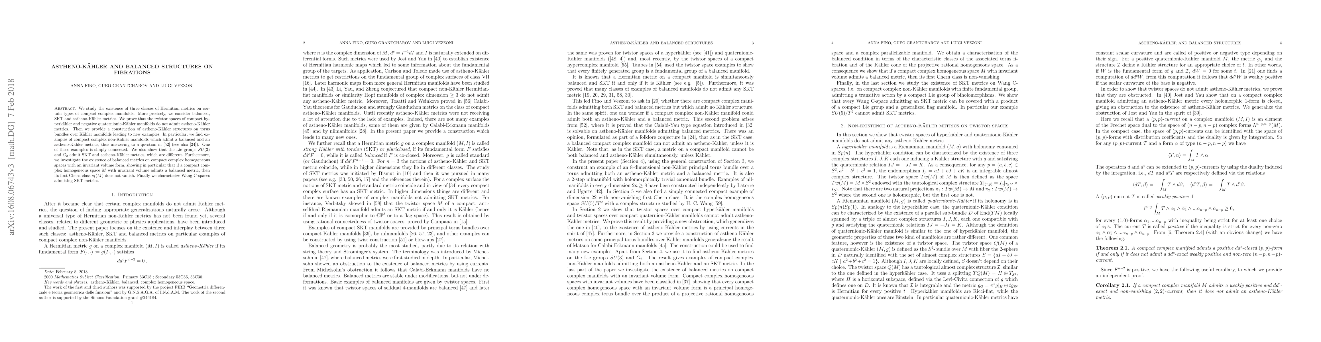 This paper investigates the existence of balanced, SKT, and astheno-Kähler metrics on specific compact complex manifolds, proving that twistor spaces of hyperkähler and negative quaternionic-Kähler manifolds do not support astheno-Kähler metrics. It also provides examples of astheno-Kähler structures on toric bundles and shows that certain Lie groups admit SKT and astheno-Kähler metrics.