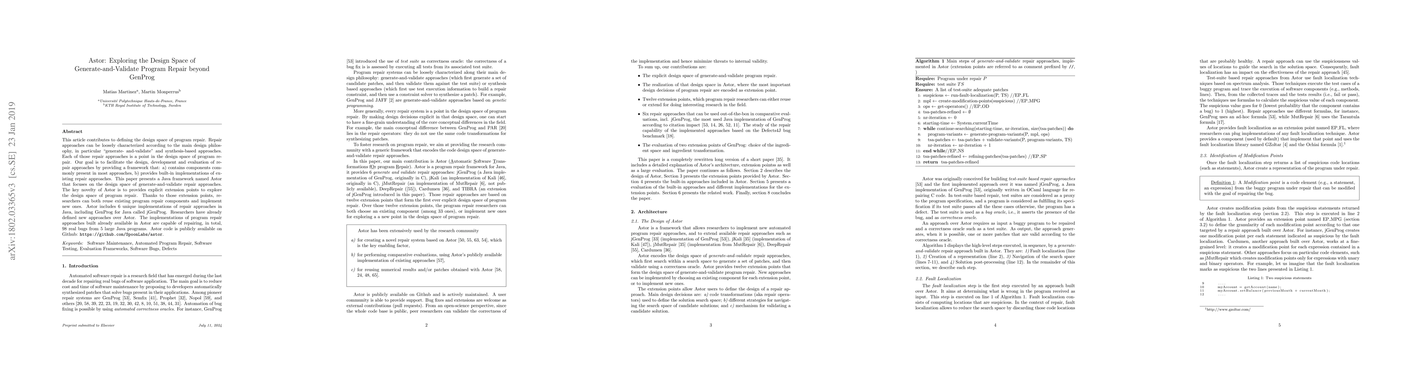 This paper introduces Astor, a framework for designing and evaluating generate-and-validate program repair approaches, providing reusable components and built-in implementations of existing repair methods. Researchers have used Astor to define new approaches, improving existing ones and successfully repairing 98 real bugs in large Java programs.