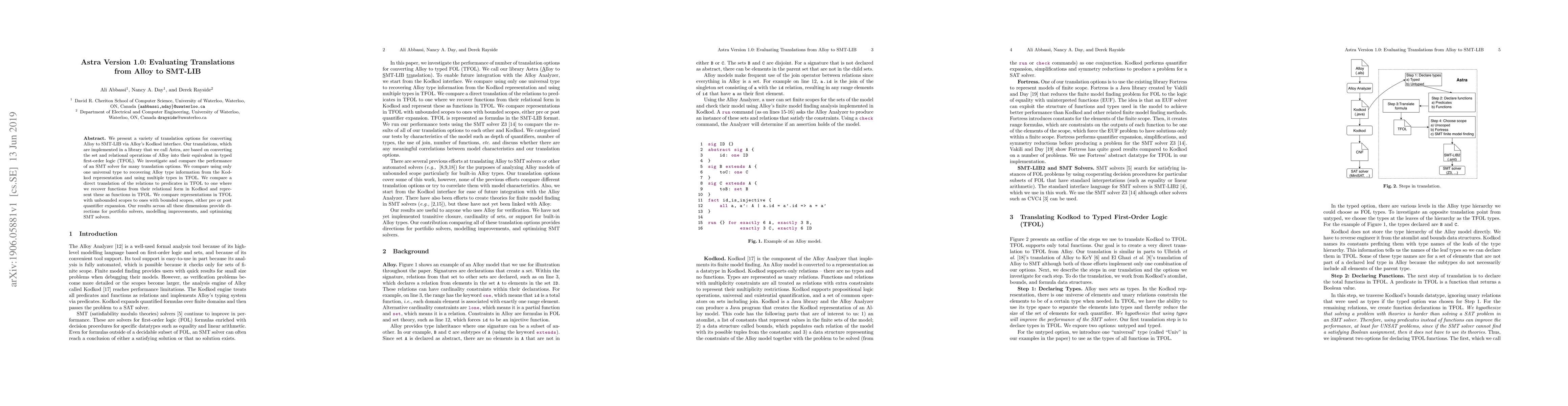 The Astra library evaluates translations from Alloy to SMT-LIB, focusing on converting Alloy's set and relational operations into typed first-order logic. Performance comparisons across different translation strategies provide insights for portfolio solvers and SMT solver optimization.