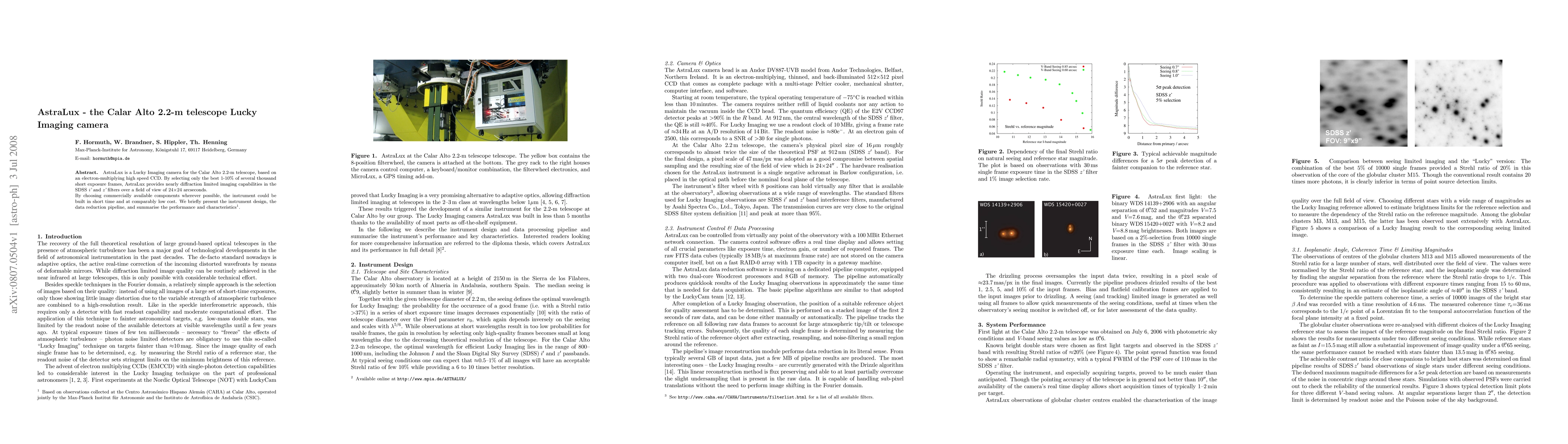 AstraLux is a Lucky Imaging camera for the Calar Alto 2.2-m telescope, utilizing an electron-multiplying CCD to achieve near-diffraction limited imaging in SDSS i' and z' filters. The camera selects the best frames from thousands to enhance image quality, built cost-effectively using commercial components.