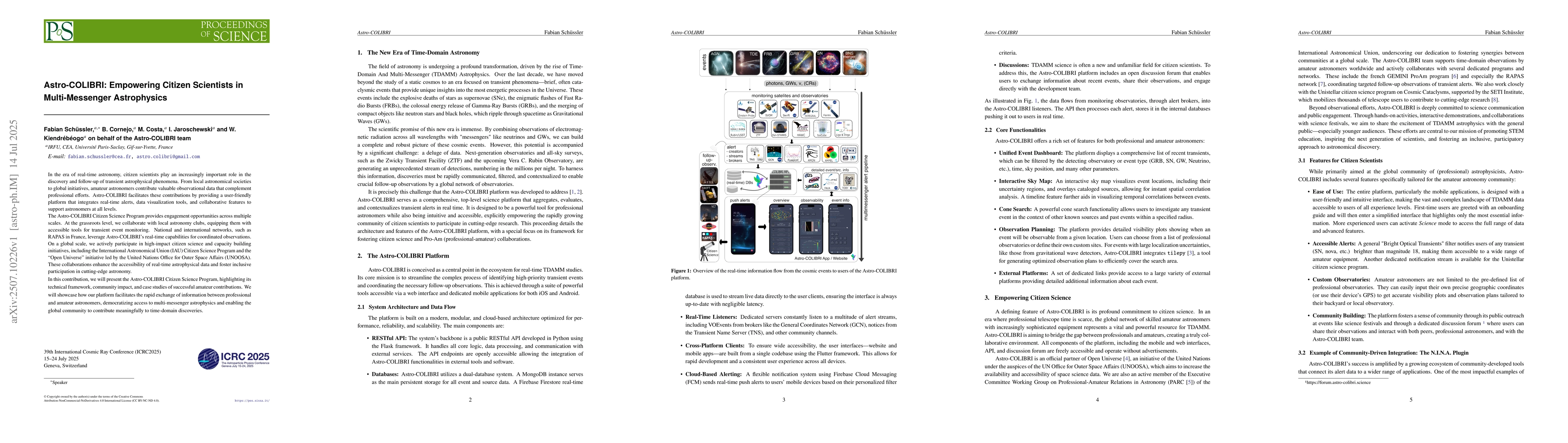 In the era of real-time astronomy, citizen scientists play an increasingly important role in the discovery and follow-up of transient astrophysical phenomena. From local astronomical societies to global initiatives, amateur astronomers contribute valuable observational data that complement professional efforts. Astro-COLIBRI facilitates these contributions by providing a user-friendly platform that integrates real-time alerts, data visualization tools, and collaborative features to support astronomers at all levels. The Astro-COLIBRI Citizen Science Program provides engagement opportunities across multiple scales. At the grassroots level, we collaborate with local astronomy clubs, equipping them with accessible tools for transient event monitoring. National and international networks, such as RAPAS in France, leverage Astro-COLIBRI's real-time capabilities for coordinated observations. On a global scale, we actively participate in high-impact citizen science and capacity building initiatives, including the International Astronomical Union (IAU) Citizen Science Program and the "Open Universe" initiative led by the United Nations Office for Outer Space Affairs (UNOOSA). These collaborations enhance the accessibility of real-time astrophysical data and foster inclusive participation in cutting-edge astronomy. In this contribution, we will present the Astro-COLIBRI Citizen Science Program, highlighting its technical framework, community impact, and case studies of successful amateur contributions. We will showcase how our platform facilitates the rapid exchange of information between professional and amateur astronomers, democratizing access to multi-messenger astrophysics and enabling the global community to contribute meaningfully to time-domain discoveries.