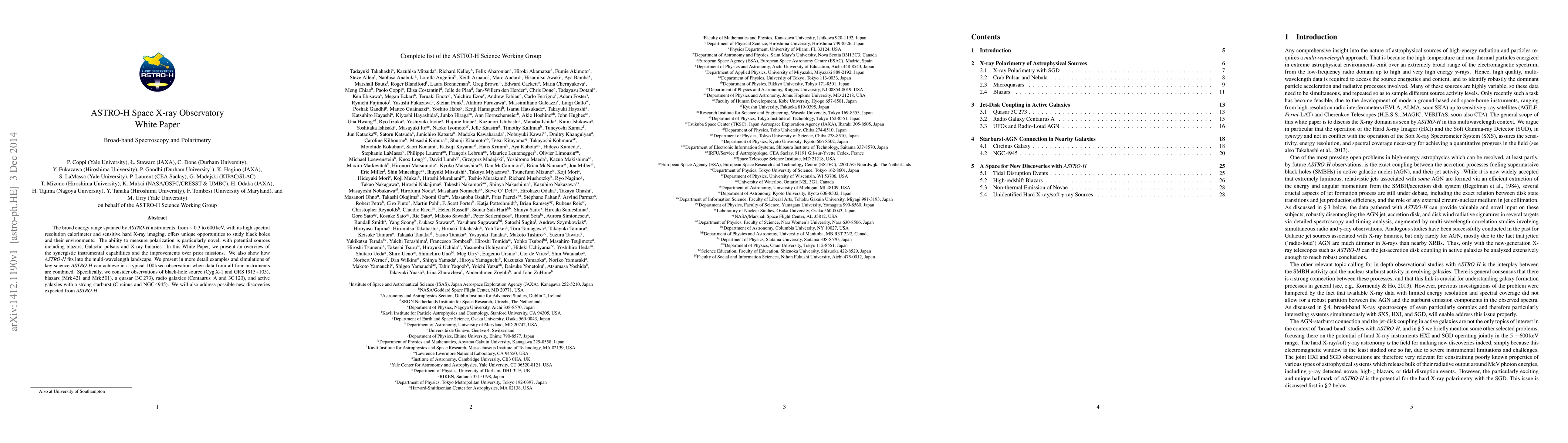 The ASTRO-H White Paper outlines the broad-band spectroscopy and polarimetry capabilities of the ASTRO-H mission, highlighting its unique range from 0.3 to 600 keV and potential to study black holes and their environments, with a focus on novel polarization measurements for various astrophysical sources. Expected discoveries include new insights from observations of black holes, blazars, and active galaxies.