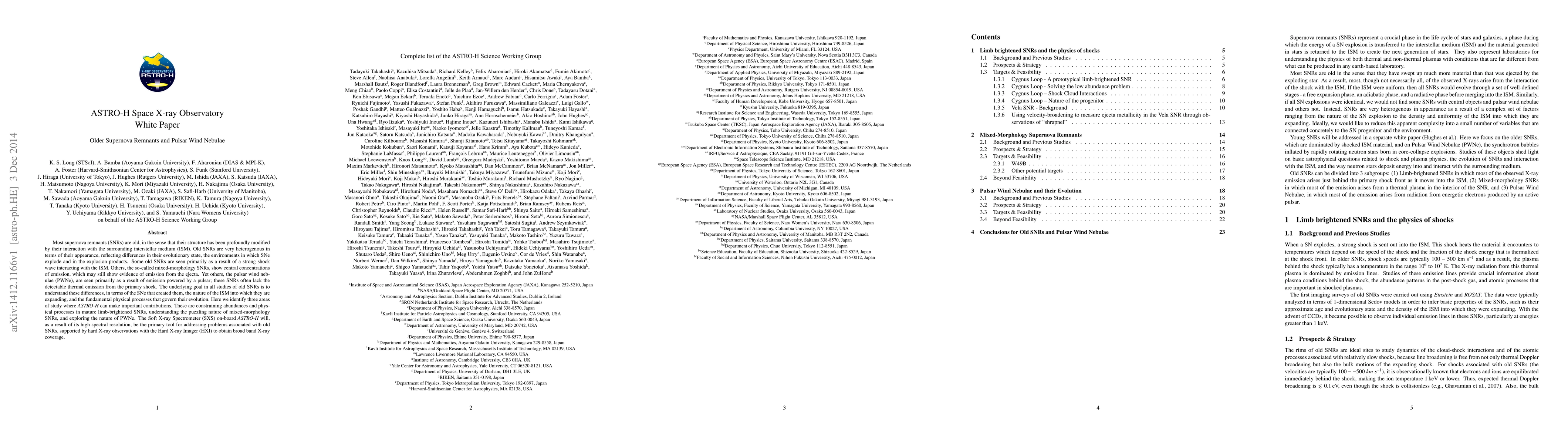 Most supernova remnants (SNRs) are old, in the sense that their structure has been profoundly modified by their interaction with the surrounding interstellar medium (ISM). Old SNRs are very heterogenous in terms of their appearance, reflecting differences in their evolutionary state, the environments in which SNe explode and in the explosion products. Some old SNRs are seen primarily as a result of a strong shock wave interacting with the ISM. Others, the so-called mixed-morphology SNRs, show central concentrations of emission, which may still show evidence of emission from the ejecta. Yet others, the pulsar wind nebulae (PWNe), are seen primarily as a result of emission powered by a pulsar; these SNRs often lack the detectable thermal emission from the primary shock. The underlying goal in all studies of old SNRs is to understand these differences, in terms of the SNe that created them, the nature of the ISM into which they are expanding, and the fundamental physical processes that govern their evolution. Here we identify three areas of study where ASTRO-H can make important contributions. These are constraining abundances and physical processes in mature limb-brightened SNRs, understanding the puzzling nature of mixed-morphology SNRs, and exploring the nature of PWNe. The Soft X-ray Spectrometer (SXS) on-board ASTRO-H will, as a result of its high spectral resolution, be the primary tool for addressing problems associated with old SNRs, supported by hard X-ray observations with the Hard X-ray Imager (HXI) to obtain broad band X-ray coverage.