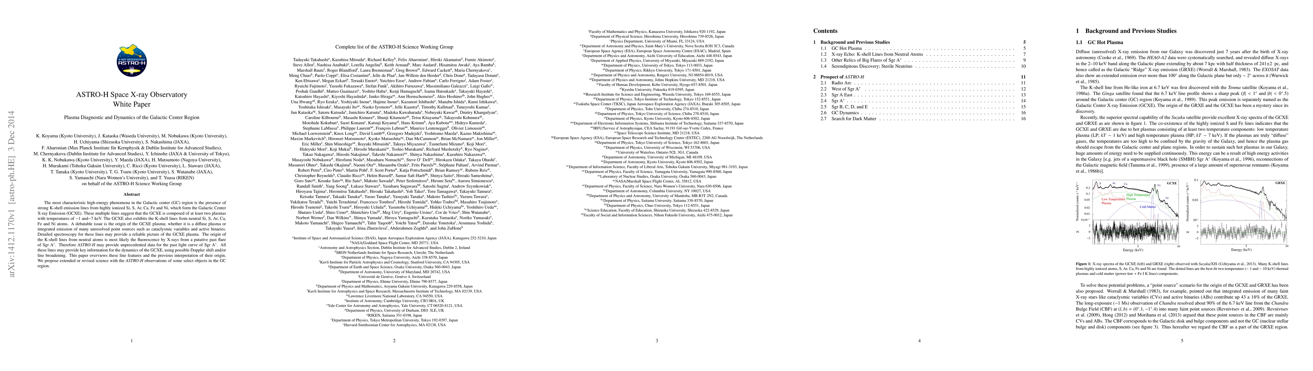 The ASTRO-H White Paper discusses the high-energy phenomena in the Galactic center region, characterized by strong K-shell emission lines from highly ionized elements, suggesting two plasmas with temperatures of ~1 and ~7 keV. The paper proposes that ASTRO-H may provide unprecedented data on the dynamics and origin of these plasmas, potentially revealing the past light curve of Sgr A* through fluorescence by X-rays.