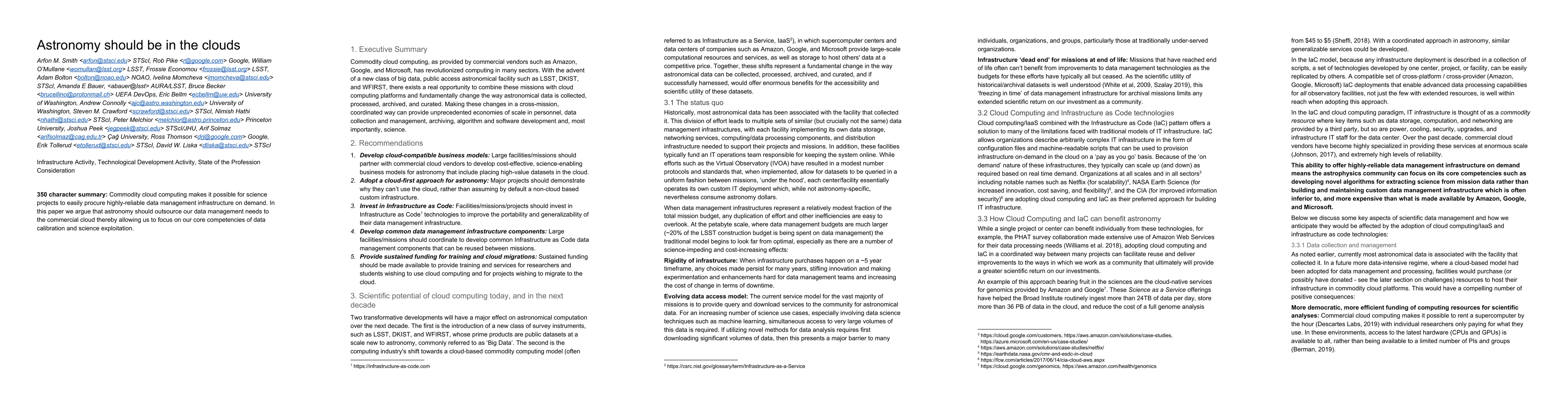 Commodity cloud computing, as provided by commercial vendors such as Amazon, Google, and Microsoft, has revolutionized computing in many sectors. With the advent of a new class of big data, public access astronomical facility such as LSST, DKIST, and WFIRST, there exists a real opportunity to combine these missions with cloud computing platforms and fundamentally change the way astronomical data is collected, processed, archived, and curated. Making these changes in a cross-mission, coordinated way can provide unprecedented economies of scale in personnel, data collection and management, archiving, algorithm and software development and, most importantly, science.