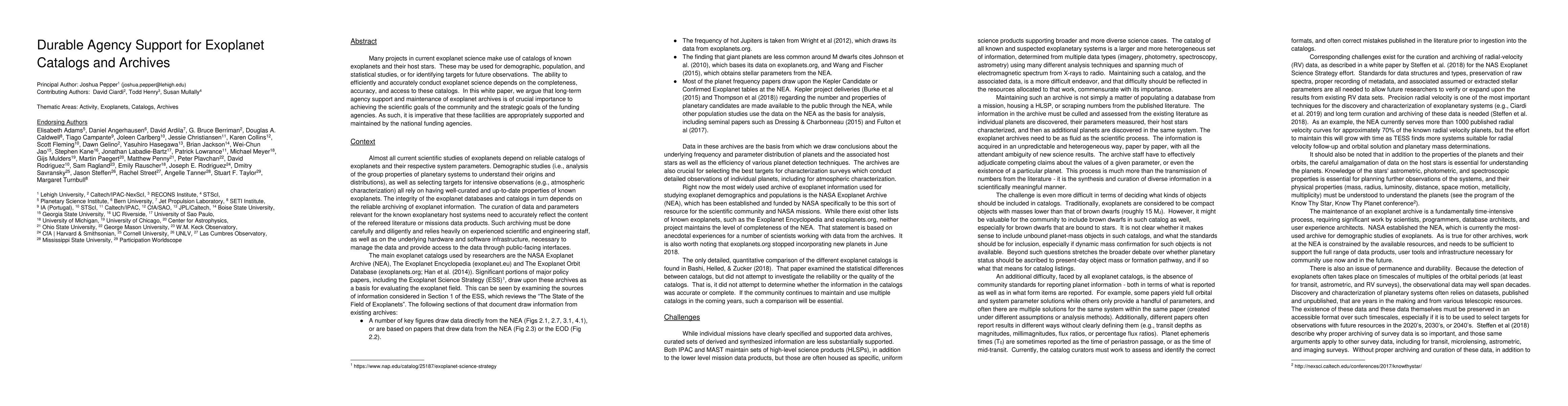 This paper argues for sustained agency support for exoplanet catalogs and archives, emphasizing their importance for demographic and statistical studies, and future observation targets. It highlights the necessity of maintaining these resources to achieve scientific and strategic goals.
